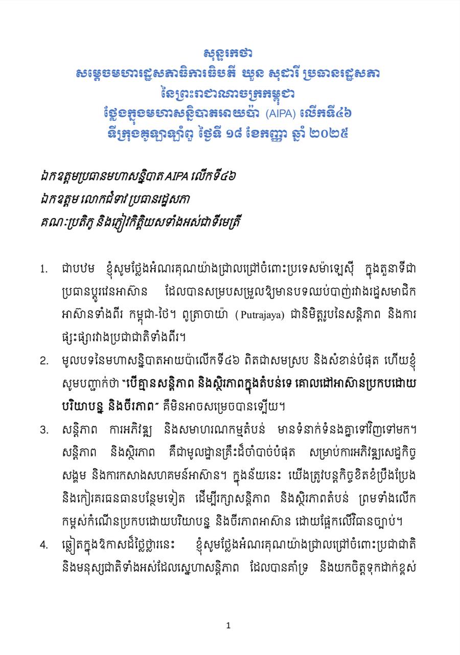 សុន្ទរកថាទាំងស្រុងរបស់ សម្តេចមហារដ្ឋសភាធិការធិបតី ឃួន សុដារី ប្រធានរដ្ឋសភានៃព្រះរាជាណាចក្រកម្ពុជាថ្លែងក្នុងមហាសន្និបាតអាយប៉ា (AIPA) លើកទី៤៦ នៅទីក្រុងគូឡាឡាំពួ ប្រទេសម៉ាឡេស៊ី នៅរសៀលថ្ងៃទី១៨ ខែកញ្ញា ឆ្នាំ២០២៥។ នៅក្នុងវេទិកានេះ សម្តេចបានអំពាវនាវសូមកុំឱ្យមានប្រើប្រាស់ “ច្បាប់ព្រៃ និងការអនុវត្តច្បាប់អាជ្ញាសឹ“ នៅក្រៅដែនដីរបស់ខ្លួន ដែលរំលោភបំពានលើអធិបតេយ្យ និងបូរណភាពទឹកដីរបស់ប្រទេសដទៃទៀតឡេីយ។