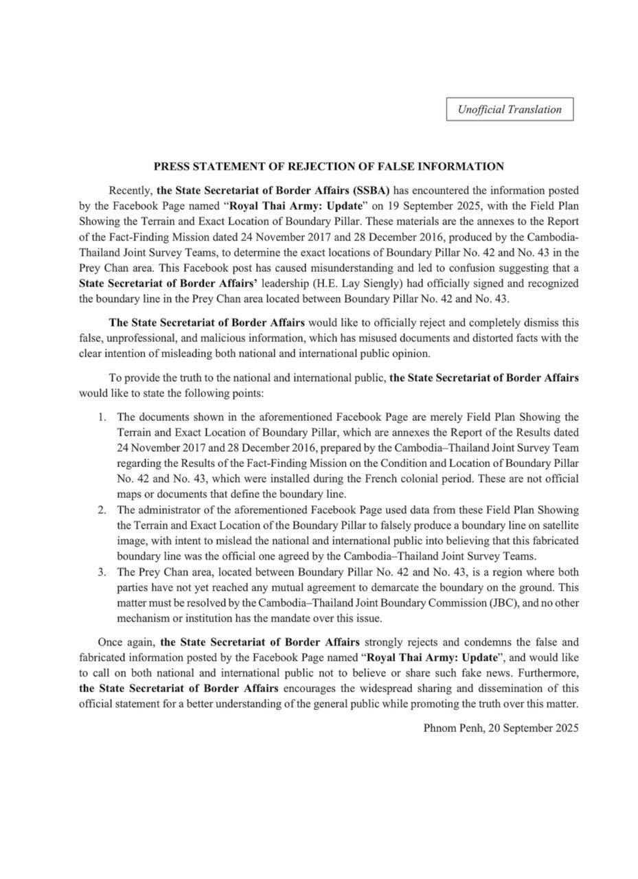Press Statement of the State Secretariat of Border Affairs (SSBA) of Rejection of False Information posted by the Facebook Page “Royal Thai Army: Update”