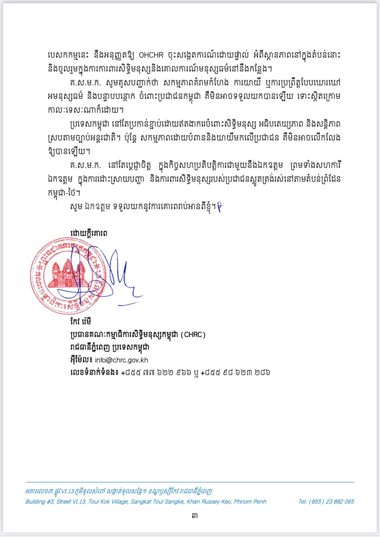 ប្រធានគណៈកម្មាធិការសិទ្ធិមនុស្សកម្ពុជា ផ្ញើញត្តិបន្ទាន់ជូន ឯកឧត្តម Volker Türk ឧត្តមស្នងការអង្គការសហប្រជាជាតិទទួលបន្ទុកសិទ្ធិមនុស្ស (OHCHR) ពាក់ព័ន្ធនឹងការប្រើប្រាស់សំឡេងរំខាន ដែលជាទម្រង់នៃការបំភិតបំភ័យ និងយាយីផ្លូវចិត្ត នៅតាមបណ្តោយព្រំដែនកម្ពុជា-ថៃ ពីសំណាក់កងទ័ពថៃ