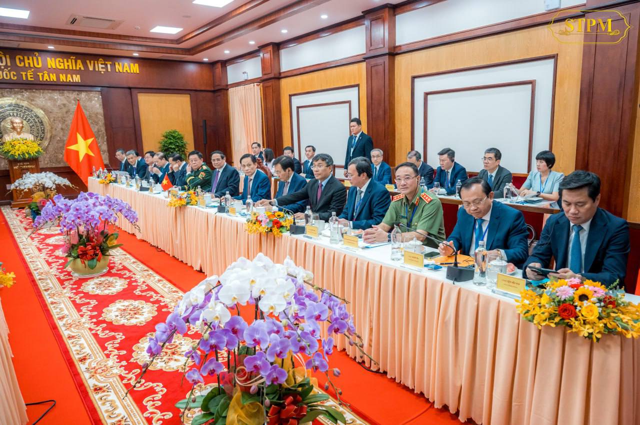 នៅក្នុងជំនួបនេះ, ឯកឧត្តមនាយករដ្ឋមន្រ្តីវៀតណាម បានសម្ដែងនូវក្តីសោមនស្សរីករាយ និងការស្វាគមន៍យ៉ាងកក់ក្ដៅចំពោះវត្តមានដ៏ខ្ពង់ខ្ពស់របស់ សម្ដេចបវរធិបតី និងគណៈប្រតិភូកម្ពុជា។ ឯកឧត្តមបានអបអរសាទរ និងវាយតម្លៃខ្ពស់ចំពោះការសម្ពោធដាក់ឱ្យដំណើរការជាផ្លូវការច្រកទ្វារព្រំដែន ម៉ឺនជ័យ-តឹនណាម ដែលជាសមិទ្ធផលថ្មីឆ្លុះបញ្ចាំងពីភាពរីកចម្រើននៃទំនាក់ទំនង និងកិច្ចសហប្រតិបត្តិការទ្វេភាគី។ ទន្ទឹមនេះ, ឯកឧត្តមបានអបអរសាទរចំពោះការសម្រេចបាននូវសមិទ្ធផលថ្មីៗរបស់កម្ពុជា ក្នុងការធានាបាននូវស្ថិរភាពនយោបាយ និងការអភិវឌ្ឍសង្គម-សេដ្ឋកិច្ច ដែលបានរួមចំណែកលើកកម្ពស់ជីវភាពប្រជាពលរដ្ឋជាលំដាប់។ ឯកឧត្តមបានបង្ហាញនូវជំនឿជឿជាក់យ៉ាងមុតមាំថា ក្រោមការដឹកនាំដ៏ឈ្លាសវៃរបស់ សម្ដេចបវរធិបតី កម្ពុជានឹងបន្តការអភិវឌ្ឍរីកចម្រើនលើគ្រប់វិស័យបន្ថែមទៀត។ ឯកឧត្តមនាយករដ្ឋមន្ត្រីវៀតណាម បានបញ្ជាក់ជាថ្មីនូវការប្ដេជ្ញាចិត្តក្នុងការបន្តជំរុញទំនាក់ទំនង និងកិច្ចសហប្រតិបត្តិការទ្វេភាគី ឱ្យកាន់តែរឹងមាំ និងស៊ីជម្រៅ។