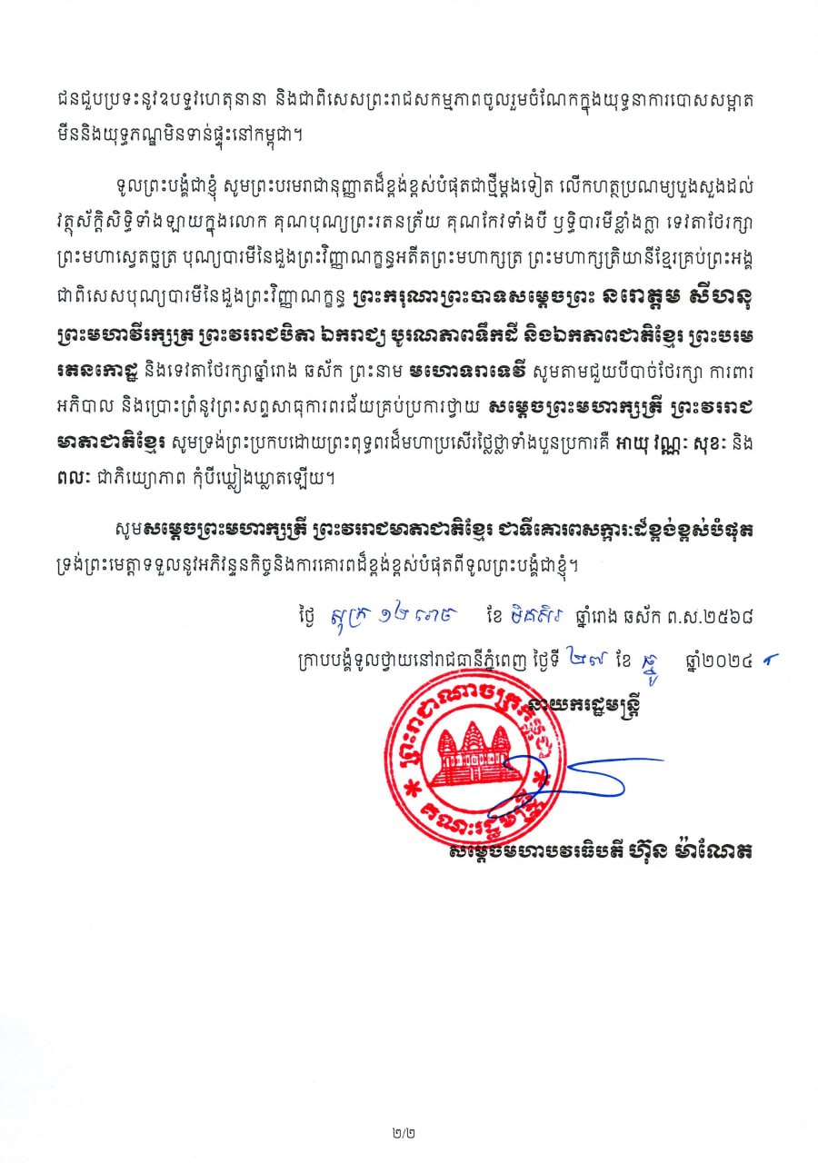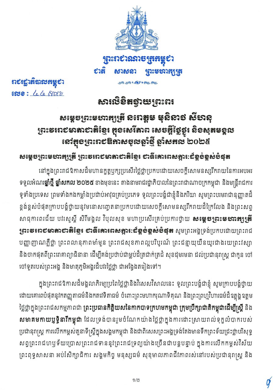 សារលិខិតថ្វាយព្រះពរ របស់ សម្តេចមហាបវរ ធិបតី ហ៊ុន ម៉ាណែត នាយករដ្ឋមន្រ្តី នៃព្រះ​រាជា​ណា​ចក្រកម្ពុជា ថ្វាយ សម្តេចព្រះមហាក្សត្រី នរោត្ដម មុនិនាថ សីហនុ ព្រះ​វរ​រាជ​មាតា​ជាតិ​ខ្មែរ ក្នុងសេរីភាព សេចក្តីថ្លៃថ្នូរ និងសុភមង្គល ក្នុងព្រះរាជឱកាសចូលឆ្នាំថ្មី ឆ្នាំសាកល ២០២៥