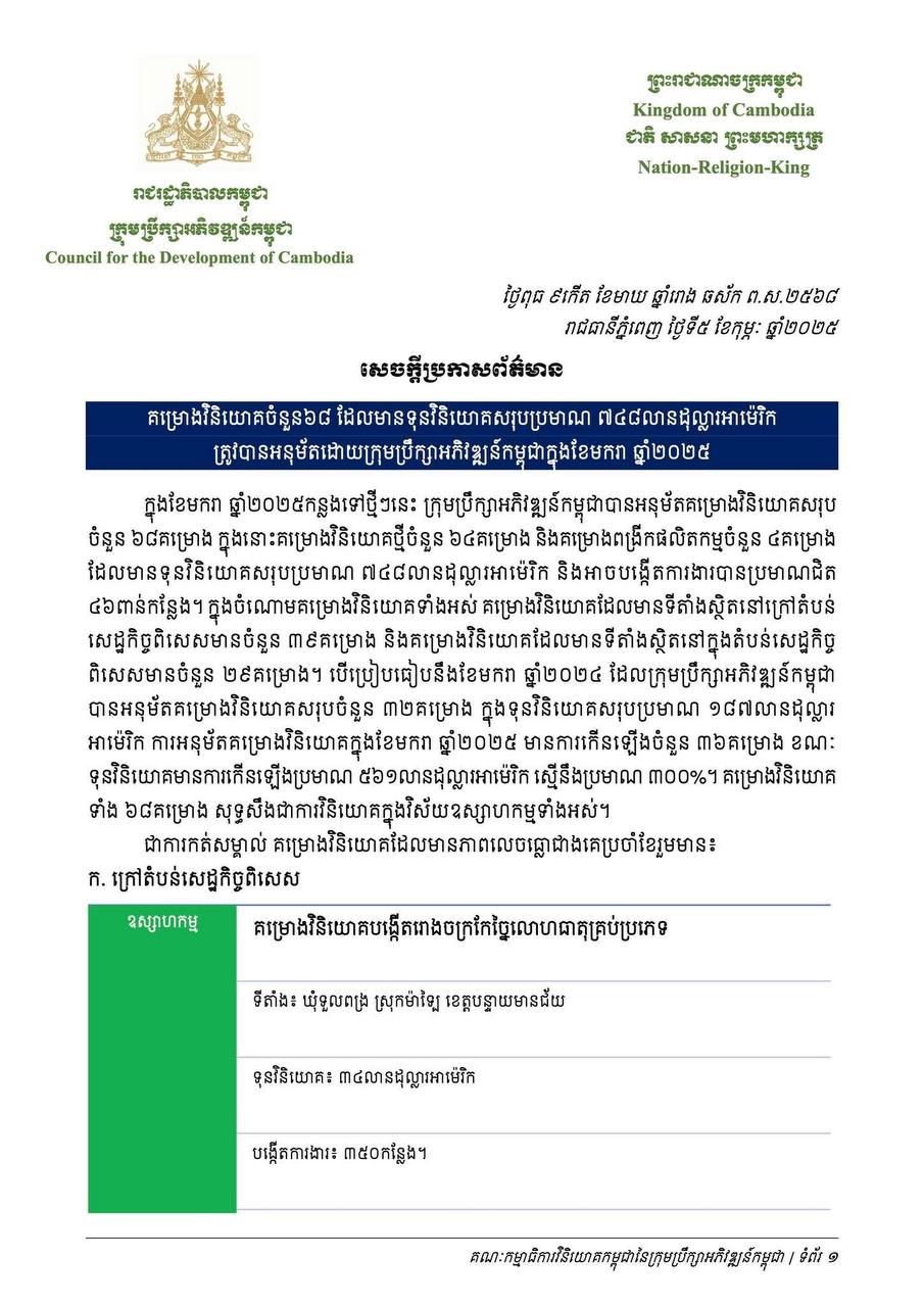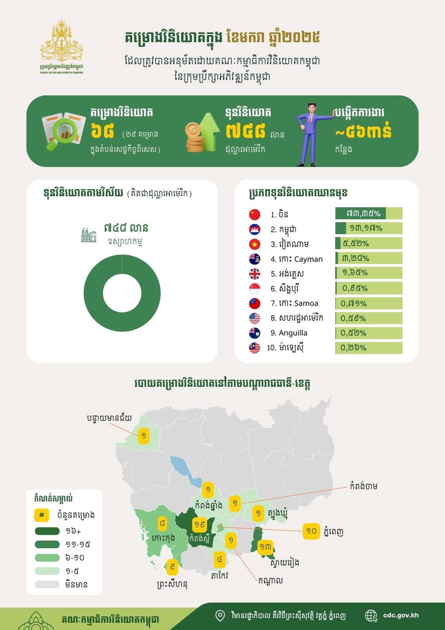 ក្នុងខែមករា ឆ្នាំ២០២៥នេះ ក្រុមប្រឹក្សាអភិវឌ្ឍន៍កម្ពុជាបានអនុម័តគម្រោងវិនិយោគសរុប ចំនួន ៦៨គម្រោង ក្នុងនោះគម្រោងវិនិយោគថ្មីចំនួន ៦៤គម្រោង និងគម្រោងពង្រីកផលិតកម្មចំនួន ៤គម្រោង ដែលមានទុនវិនិយោគសរុបប្រមាណ ៧៤៨លានដុល្លារ និងអាចបង្កើតការងារបានប្រមាណជិត ៤៦ពាន់កន្លែង។