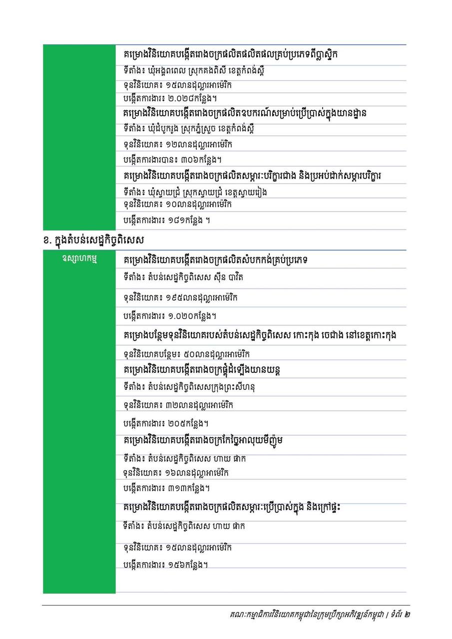 នៅក្នុងសេចក្ដីប្រកាសព័ត៌មានរបស់ក្រុមប្រឹក្សាអភិវឌ្ឍន៍កម្ពុជា ចុះថ្ងៃទី៥ ខែកុម្ភៈ ឆ្នាំ២០២៥ បានឱ្យដឹងថា ក្នុងចំណោមគម្រោងវិនិយោគទាំងអស់ គម្រោងវិនិយោគដែលមានទីតាំងស្ថិតនៅក្រៅតំបន់ សេដ្ឋកិច្ចពិសេសមានចំនួន ៣៩គម្រោង និងគម្រោងវិនិយោគដែលមានទីតាំងស្ថិតនៅក្នុងតំបន់សេដ្ឋកិច្ច ពិសេសមានចំនួន ២៩គម្រោង។