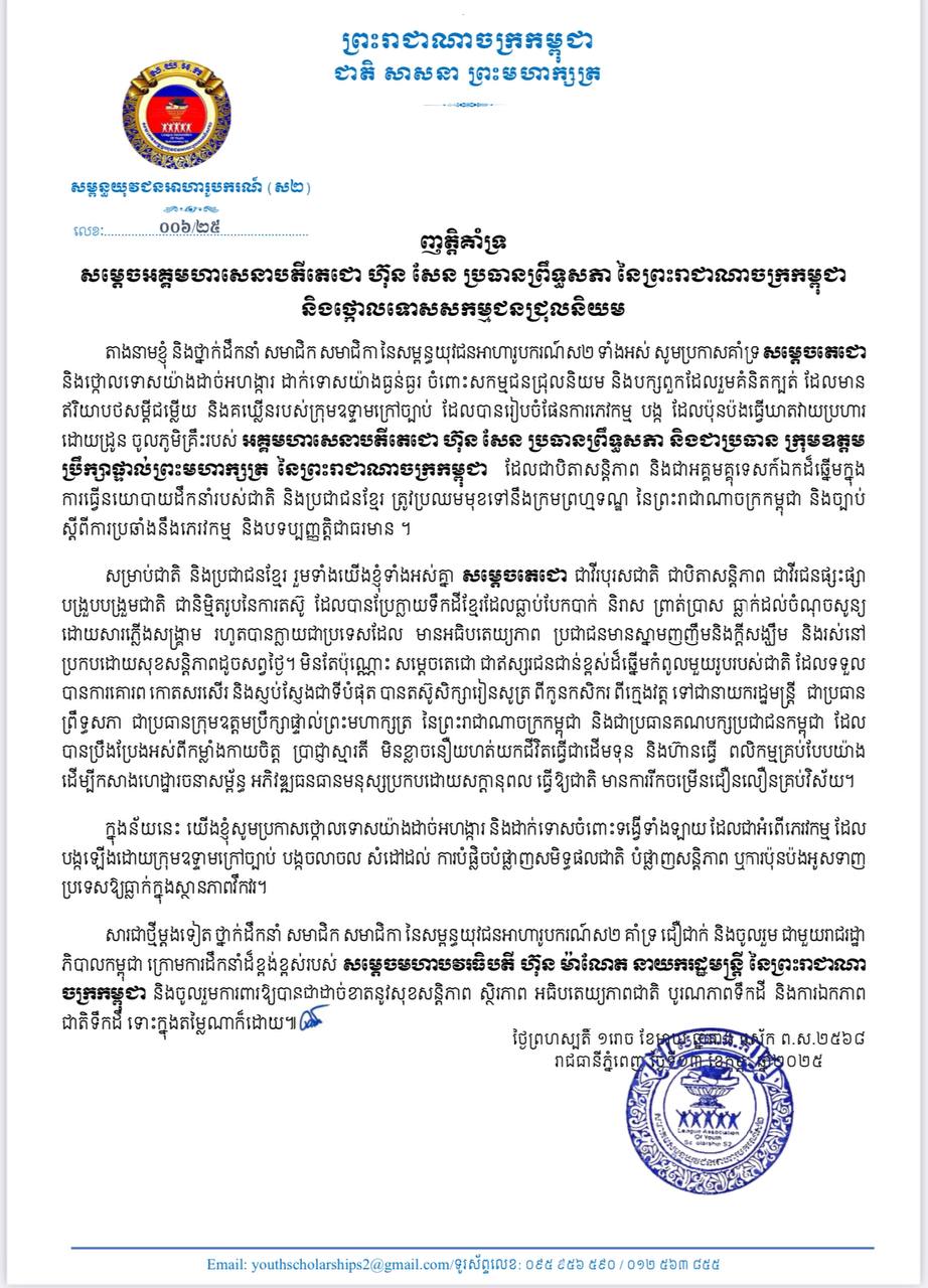 សម្ពន្ធយុវជនអាហារូបករណ៍ (ស២) សូមប្រកាសគាំទ្រ សម្តេចតេជោ និងថ្កោលទោសយ៉ាងដាច់អហង្ការ ដាក់ទោសយ៉ាងធ្ងន់ធ្ងរ ចំពោះសកម្មជនជ្រុលនិយម និងបក្សពួក