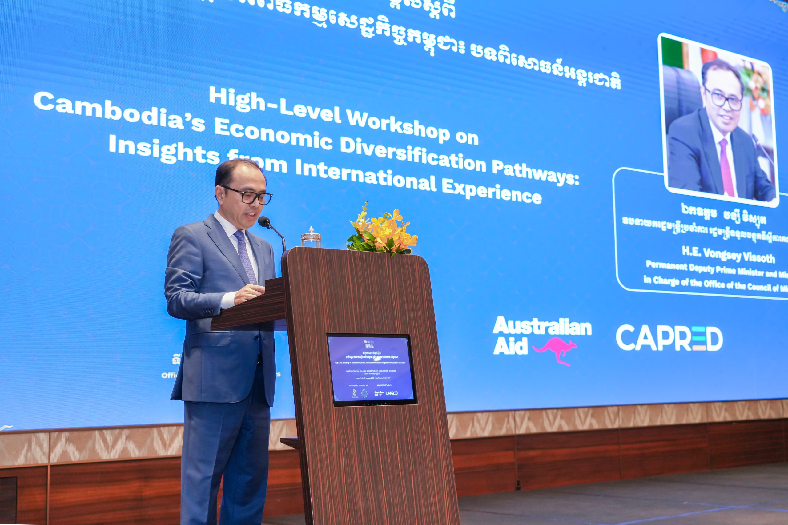 (ភ្នំពេញ)៖ នៅព្រឹកថ្ងៃទី២០ ខែកុម្ភៈ ឆ្នាំ២០២៥ នៅសណ្ឋាគារ ហៃយ៉ាត់ រីជិនស៊ី ភ្នំពេញ ឯកឧត្តម វង្សី វិស្សុត ឧបនាយករដ្ឋមន្រ្តីប្រចាំការ រដ្ឋមន្រ្តីទទួលបន្ទុកទីស្តីការគណៈរដ្ឋមន្រ្តីបានចូលរួមបើកសិក្ខាសាលាកម្រិតខ្ពស់ ស្តីពី “មាគ៌ាឆ្ពោះទៅការបង្កើនពិពិធកម្មសេដ្ឋកិច្ចកម្ពុជា៖ បទពិសោធអន្តរជាតិ” (High-Level Workshop: Cambodia’s Economic Diversification Pathways-Insights from International Experience) ដោយមានការចូលរួមពី ឯកឧត្តម ស៊ុន ចាន់ថុល ឧបនាយករដ្ឋមន្រ្តី និងជាអនុប្រធានទី១ នៃក្រុមប្រឹក្សាអភិវឌ្ឍន៍កម្ពុជា ឯកឧត្តម ហែម វណ្ណឌី រដ្ឋមន្ត្រីក្រសួងឧស្សាហកម្ម វិទ្យាសាស្ត្រ បច្ចេកវិទ្យា និងនវានុវត្តន៍ ឯកឧត្តម Derek Yip ឯកអគ្គរដ្ឋទូតអូស្ត្រាលីប្រចាំព្រះរាជាណាចក្រកម្ពុជា តំណាងក្រសួងស្ថាប័ននានា ដៃគូអភិវឌ្ឍន៍ និងវិស័យឯកជន ព្រមទាំងអ្នកស្រាវជ្រាវជាតិ និងអន្តរជាតិជាច្រើនរូប។ សិក្ខាសាលានេះ ក៏មានការចូលរួម និងចែករំលែកនូវចំណេះដឹងស្រាវជ្រាវអំពី មាគ៌ានៃការធ្វើពិពិធកម្មសេដ្ឋកិច្ចកម្ពុជា និងការយល់ដឹងពីបទពិសោធអន្តរជាតិ ពីលោកសាស្រ្តាចារ្យ Ricardo Hausmann ពីសកលវិទ្យាល័យ Harvard ដែលលោកសាស្រ្តាចារ្យត្រូវបានទទួលស្គាល់ជាសេដ្ឋវិទូអភិវឌ្ឍន៍មួយរូបដ៏ល្បីល្បាញលើពិភពលោក ហើយធ្លាប់បានផ្តល់អនុសាសន៍ដល់រដ្ឋាភិបាលប្រទេសជាច្រើនជុំវិញពិភពលោក អំពីយុទ្ធសាស្ត្រក្នុងការធ្វើពិពិធកម្មសេដ្ឋកិច្ច និងការដោះស្រាយបញ្ហាស្មុគស្មាញនានាក្នុងសេដ្ឋកិច្ច។