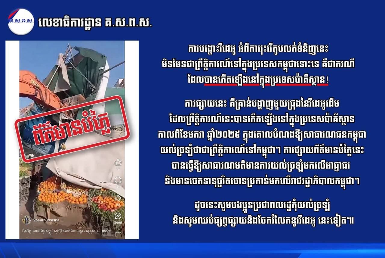 លេខាធិការដ្ឋាន គ.ស.ព.ស. ក៏បានគូសបញ្ជាក់ថា ការផ្សព្វផ្សាយវីដេអូស្ដីពីការរុះរើតូបលក់ទំនិញនេះ គ្រាន់តែបង្ហាញមួយជ្រុងនៃវីដេអូដើមដែលបានកើតឡើងនៅក្នុងប្រទេសប៉ាគីស្ថានកាលពីខែមករា ឆ្នាំ២០២៥ ក្នុងគោលបំណងធ្វើឲ្យសាធារណៈជនយល់ច្រឡំថាជាព្រឹត្តិការណ៍នៅក្នុងប្រទេសកម្ពុជាយើង។ ការផ្សព្វផ្សាយបែបនេះមានគោលបំណងទុច្ចរិតធ្វើឲ្យប្រជាពលរដ្ឋមានការយល់ច្រឡំមកលើអាជ្ញាធរក៏ដូចជាចោទប្រកាន់មកលើរាជរដ្ឋាភិបាល។
