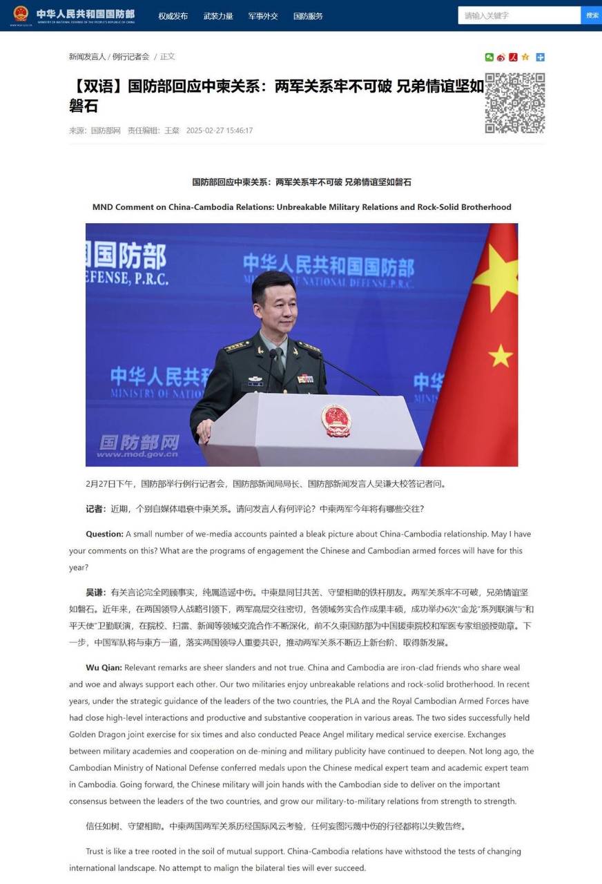 នារសៀលថ្ងៃទី២៧ ខែកុម្ភៈ ក្រសួងការពារជាតិចិនបានធ្វើសន្និសីទសារព័ត៌មានប្រចាំថ្ងៃ ហើយលោក Wu Qian នាយកការិយាល័យព័ត៌មាននៃក្រសួងការពារជាតិចិន និងជាអ្នកនាំពាក្យក្រសួងការពារជាតិចិន បានឆ្លើយសំណួររបស់អ្នកសារព័ត៌មាន។