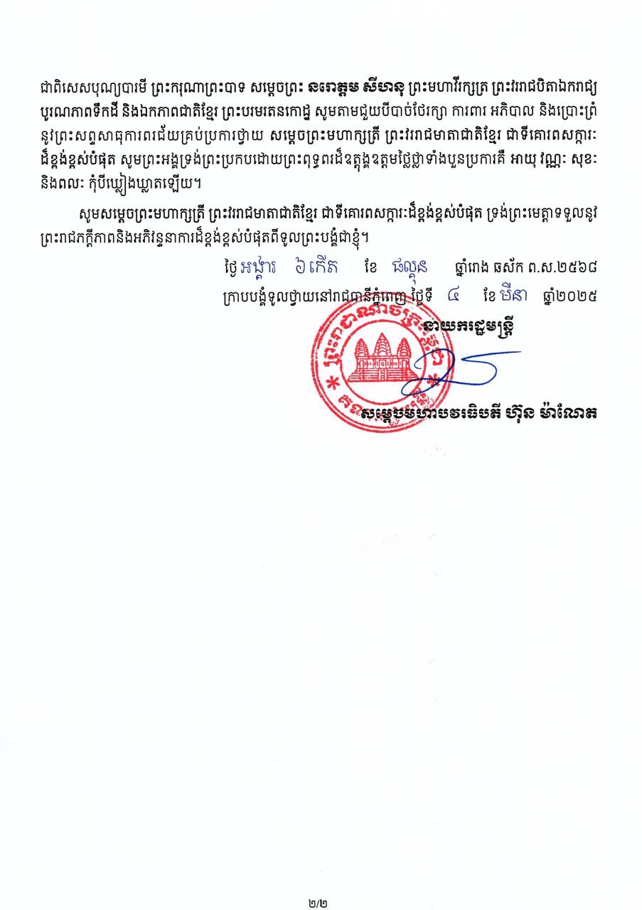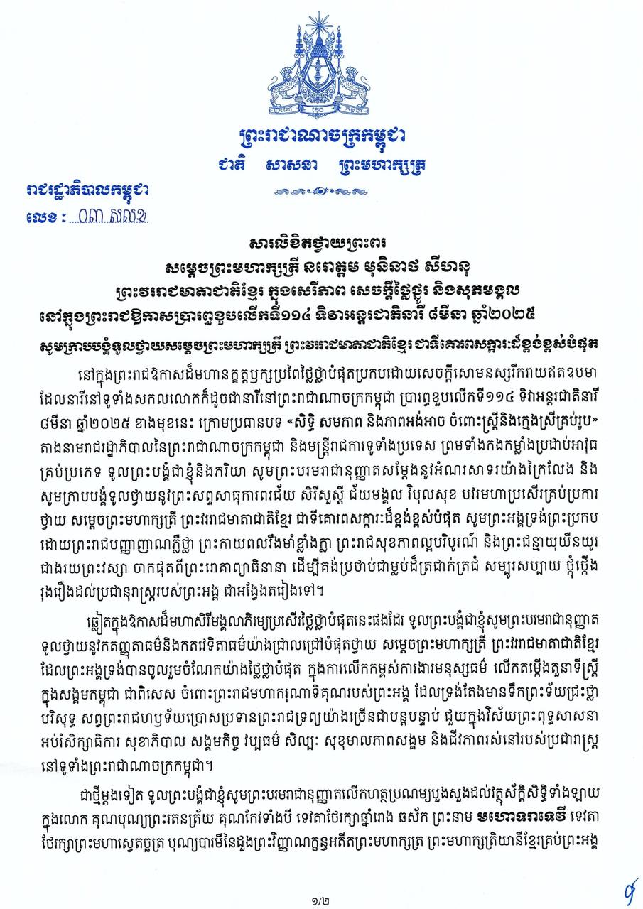 សារលិខិត សម្តេចមហាបវរធិបតី ហ៊ុន ម៉ាណែត នាយករដ្ឋមន្ត្រី នៃព្រះរាជាណាចក្រកម្ពុជា ទូលថ្វាយព្រះពរ សម្តេចព្រះមហាក្សត្រី នរោត្តម មុនិនាថ សីហនុ ព្រះវររាជមាតាជាតិខ្មែរ ក្នុងសេរីភាព សេចក្តីថ្លៃថ្នូរ និងសុភមង្គល នៅក្នុងព្រះរាជវរោកាសប្រារព្ធខួបលើកទី១១៤ ទិវាអន្តរជាតិនារី ៨មីនា ឆ្នាំ២០២៥