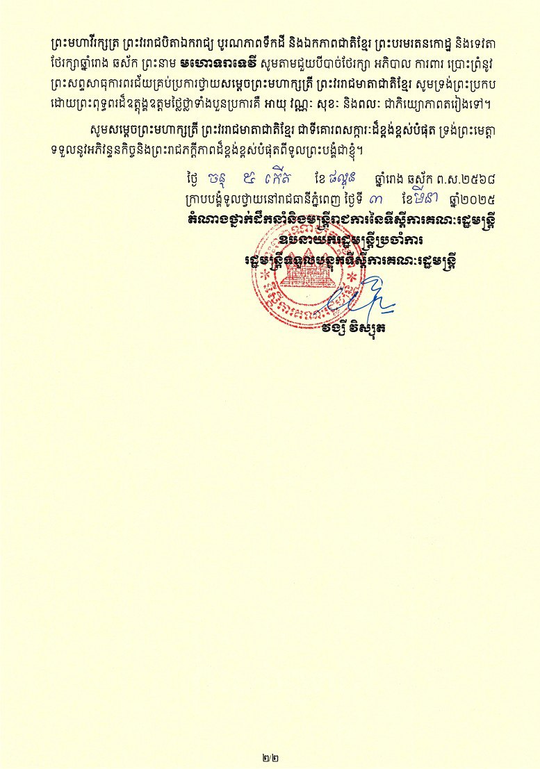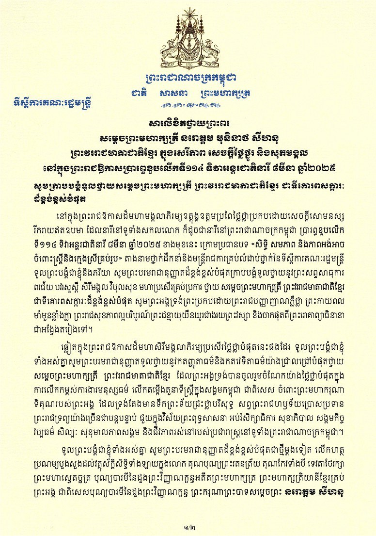 ឯកឧត្តម វង្សី វិស្សុត ឧបនាយករដ្ឋមន្ត្រីប្រចាំការ រដ្ឋមន្ត្រីទទួលបន្ទុកទីស្តីការគណៈរដ្ឋមន្ត្រី ថ្វាយសារលិខិតថ្វាយព្រះពរ សម្តេចព្រះមហាក្សត្រី នរោត្តម មុនិនាថ សីហនុ ព្រះវររាជមាតាជាតិខ្មែរ ក្នុងសេរីភាព សេចក្តីថ្លៃថ្នូរ និងសុភមង្គល នៅក្នុងព្រះរាជឱកាសប្រារព្ធខួបលើកទី១១៤ ទិវាអន្តរជាតិនារី ៨មីនា ឆ្នាំ២០២៥