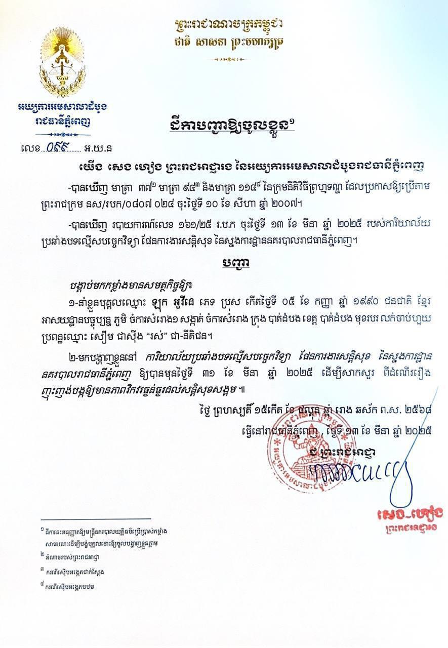 ការចាប់ខ្លួនជននេះ ត្រូវបានធ្វើឡើងនៅថ្ងៃទី១៤ ខែមីនា ឆ្នាំ២០២៥ ដោយកម្លាំងស្នងការដ្ឋាននគរបាលរាជធានីភ្នំពេញ សហការជាមួយកម្លាំងស្នងការដ្ឋាននគរបាលខេត្តបាត់ដំបង។