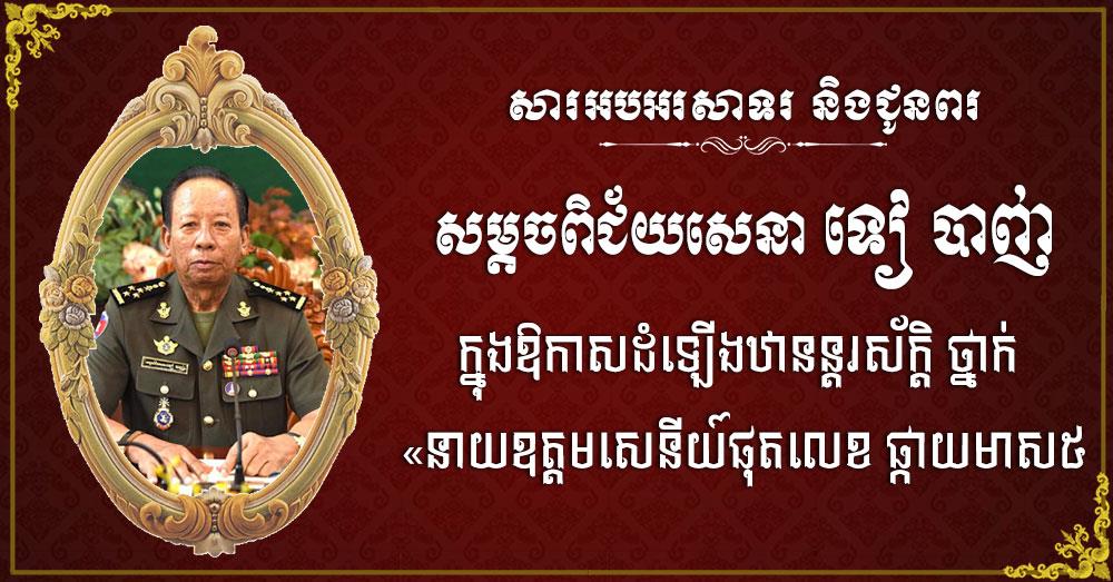 ឯកឧត្តម ស្វាយ ស៊ីថា ទេសរដ្ឋមន្រ្តី ទទួលបន្ទុកបេសកកម្មពិសេស និងជាប្រធានគណៈកម្មាធិការជាតិសម្របសម្រួលកិច្ចការព័ត៌មាន និងសាធារណមតិ សូមសម្តែងនូវការអបអរសាទរប្រកបដោយសេចក្តីសោមនស្សរីករាយ និងកក់ក្តៅបំផុតជូនចំពោះ សម្តេចពិជ័យសេនា ទៀ បាញ់ ឧត្តមប្រឹក្សាផ្ទាល់ព្រះមហាក្សត្រ នាឱកាសដែលត្រូវបាន ព្រះករុណា ព្រះបាទសម្តេចព្រះ បរមនាថ នរោត្តម សីហមុនី ព្រះមហាក្សត្រនៃព្រះរាជាណាចក្រកម្ពុជា ជាទីគោរពសក្ការៈដ៏ខ្ពង់ខ្ពស់បំផុត ត្រាស់បង្គាប់ ដំឡើងឋានន្តរស័ក្តិថ្នាក់ «នាយឧត្តមសេនីយ៍ផុតលេខ ផ្កាយមាស៥ នៃកងយោធពលខេមរភូមិន្ទ» នៅថ្ងៃទី១៦ ខែមីនា ឆ្នាំ២០២៥។