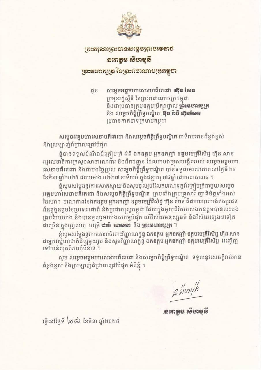 ព្រះករុណា ព្រះបាទសម្តេចព្រះបរមនាថ នរោត្តម សីហមុនី ព្រះមហាក្សត្រ នៃព្រះរាជាណាចក្រកម្ពុជា បានប្រោសប្រទានព្រះរាជសាររំលែកទុក្ខជូនសម្តេចអគ្គមហាសេនាបតីតេជោ ហ៊ុន សែន ប្រមុខរដ្ឋស្តីទី នៃព្រះរាជាណាចក្រកម្ពុជា និងជាប្រធានក្រុមឧត្តមប្រឹក្សាផ្ទាល់ ព្រះមហាក្សត្រ និង សម្តេចកិត្តិព្រឹទ្ធបណ្ឌិត ប៊ុន រ៉ានី ហ៊ុនសែន ប្រធានកាកបាទក្រហមកម្ពុជា ចំពោះមរណភាពរបស់ ឯកឧត្តម អ្នកឧកញ៉ា ឧត្តមមេត្រីវិសិដ្ឋ ហ៊ុន សាន បងប្រុសច្បងរបស់ សម្តេចតេជោ ហ៊ុន សែន ដែលបានទទួលអនិច្ចកម្ម នាម៉ោង២៖២៧នាទីព្រឹកថ្ងៃទី២៨ ខែមីនា ឆ្នាំ២០២៥ ក្នុងជន្មាយុ៧៨ឆ្នាំ ដោយរោគាពាធ។