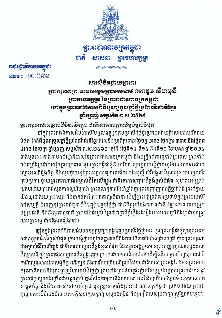 សារលិខិតថ្វាយព្រះពរ ព្រះករុណាព្រះបាទសម្តេចព្រះបរមនាថ នរោត្តម សីហមុនី ព្រះមហាក្សត្រ នៃព្រះរាជាណាចក្រកម្ពុជា នៅក្នុងព្រះរាជឱកាសពិធីបុណ្យចូលឆ្នាំថ្មីប្រពៃណីជាតិខ្មែរ ឆ្នាំម្សាញ់ សប្តស័ក ព.ស.២៥៦៩