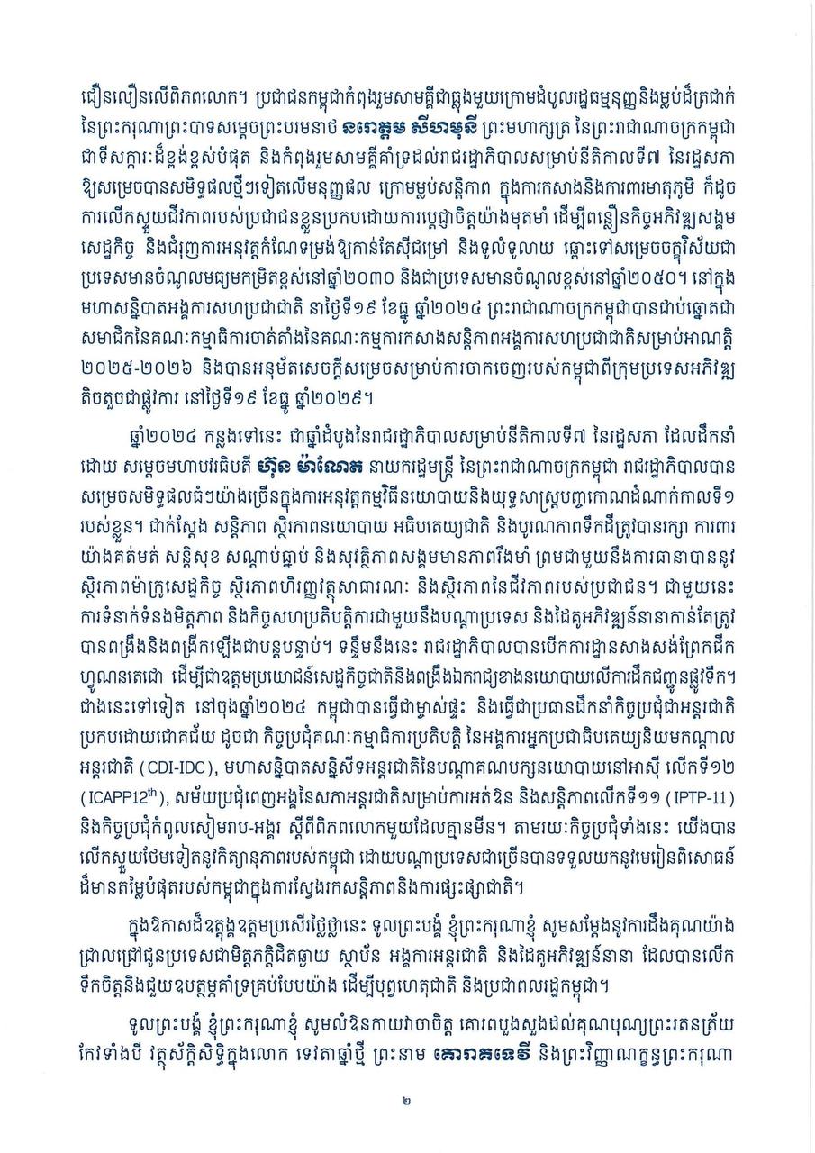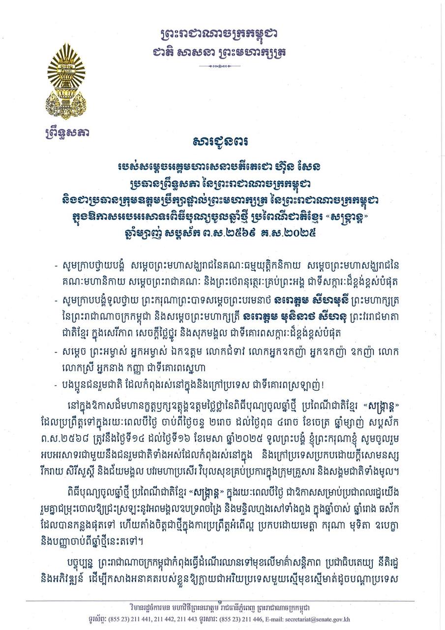 សម្តេចអគ្គមហាសេនាបតីតេជោ ហ៊ុន សែន ប្រធានព្រឹទ្ធសភា នៃព្រះរាជាណាចក្រកម្ពុជា និងជាប្រធានក្រុមឧត្តមប្រឹក្សាផ្ទាល់ព្រះមហាក្សត្រ ផ្ញើសារលិខិតជូនពរបងប្អូនជនរួមជាតិខ្មែរ ក្នុងឱកាសអបអរសាទរពិធីបុណ្យចូលឆ្នាំថ្មី ប្រពៃណីជាតិខ្មែរ «សង្ក្រាន្ត» ឆ្នាំម្សាញ់