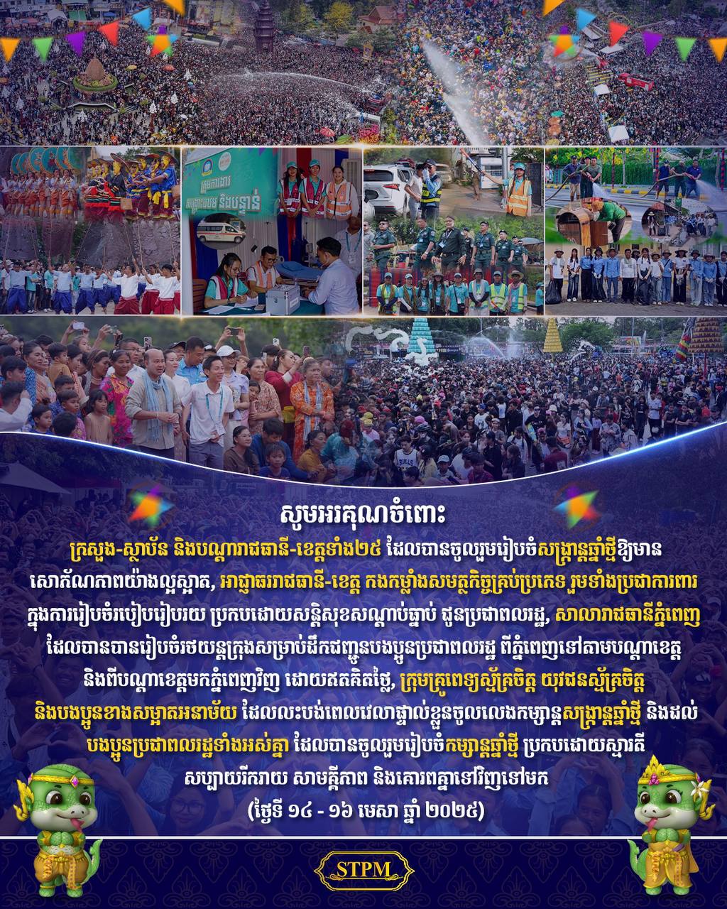 សម្តេចមហាបវរធិបតី ហ៊ុន ម៉ាណែត នាយករដ្ឋមន្ត្រី នៃព្រះរាជាណាចក្រកម្ពុជា នាព្រឹកថ្ងៃទី១៧ ខែមេសា ឆ្នាំ២០២៥ បានមានប្រសាសន៍ក្នុងបណ្តាញតេឡេក្រាមផ្លូវការរបស់សម្តេច ថា៖ «ក្នុងនាមរាជរដ្ឋាភិបាល និងក្នុងនាមខ្លួនខ្ញុំផ្ទាល់ ខ្ញុំសូមថ្លែងអំណរគុណយ៉ាងជ្រាលជ្រៅចំពោះក្រសួង-ស្ថាប័ន អាជ្ញាធរដែនដីគ្រប់លំដាប់ថ្នាក់ គ្រប់រាជធានី-ខេត្ត ក៏ដូចជានៅក្រៅប្រទេស កងយោធពលខេមរភូមិន្ទ កងនគរបាលជាតិ កងរាជអាវុធហត្ថ ប្រជាការពារ អ្នកអនាម័យ និងកម្លាំងស្ម័គ្រចិត្តគ្រប់យន្តការទាំងអស់ ដែលបានចូលរួមសហការបំពេញភារកិច្ចរៀបចំ តុបតែង និងប្រចាំការការពារសន្តិសុខសណ្តាប់ធ្នាប់ ធានាបាននូវសុវត្ថិភាព បង្កលក្ខណៈដល់ការកម្សាន្តសប្បាយរបស់លោកតាលោកយាយ អ៊ំពូមីង បងប្អូន ព្រមទាំងបានញ៊ាំងឱ្យការប្រារព្ធពិធីបុណ្យចូលឆ្នាំថ្មីប្រពៃណីជាតិខ្មែរ ឆ្នាំម្សាញ់ សប្ដស័ក ព.ស ២៥៦៨ នៅទូទាំងប្រទេស បានប្រព្រឹត្តទៅដោយភាពសប្បាយរីករាយ សោភ័ណភាព សេចក្តីថ្លៃថ្នូរ សុខសុវត្ថិភាព របៀបរៀបរយល្អ ប្រកបដោយមោទកភាពជាតិ។