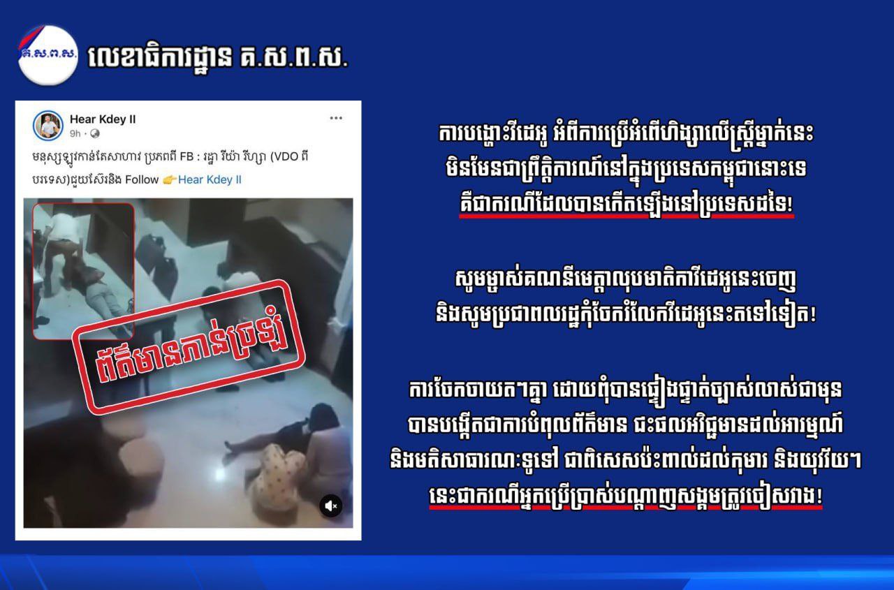 នាព្រឹកថ្ងៃពុធ ទី២៨ ខែឧសភា ឆ្នាំ២០២៥ នេះ លេខាធិការដ្ឋាននៃគណៈកម្មាធិការជាតិសម្របសម្រួលកិច្ចការព័ត៌មាននិងសាធារណមតិ ហៅកាត់ថា គ.ស.ព.ស. បានចេញមកបញ្ជាក់ថា ការបង្ហោះវីដេអូ ដែលបង្ហាញពីមនុស្សមួយក្រុមប្រើអំពើហិង្សាវាយកម្ទេចសម្ភារៈរបស់ភាគីម្ខាងទៀត “មិនមែនជាព្រឹត្តិការណ៍នៅក្នុងប្រទេសកម្ពុជានោះទេ ប៉ុន្តែគឺជាករណីដែលបានកើតឡើងនៅប្រទេសដទៃប៉ុណ្ណោះ!”