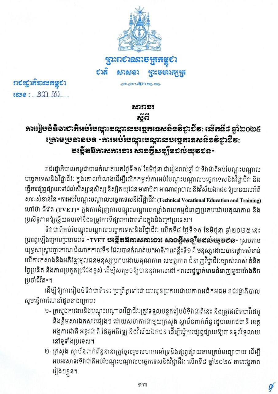 សារាចរ ស្តីពី ការរៀបចំទិវាជាតិអប់រំបណ្តុះបណ្តាលបច្ចេកទេសនិងវិជ្ជាជីវៈ លើកទី៨ ឆ្នាំ២០២៥ ក្រោមប្រធានបទ «ការអប់រំបណ្តុះបណ្តាលបច្ចេកទេសនិងវិជ្ជាជីវៈ បង្កើតឱកាសការងារ សាងក្តីសង្ឃឹមដល់យុវជន»