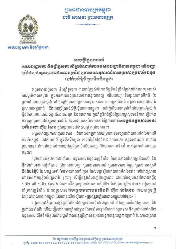 អង្គសមាជរដ្ឋសភា និងព្រឹទ្ធសភា វាយតម្លៃខ្ពស់ចំពោះកិច្ចខិតខំប្រឹងប្រែងយ៉ាងមោះមុតរបស់រាជរដ្ឋាភិបាលកម្ពុជា ក្នុងការការពារឱ្យបានដាច់ខាតនូវឯករាជ្យ អធិបតេយ្យ និងបូរណភាពទឹកដីនៃព្រះរាជាណាចក្រកម្ពុជាដោយប្រើប្រាស់យន្តការការទូត ការចរចា យន្តការតំបន់ អង្គការសហប្រជាជាតិ តុលាការអន្តរជាតិ និងការប្រើប្រើប្រាស់សិទ្ធិស្វ័យការពារខ្លួន។ រាជរដ្ឋាភិបាលកម្ពុជាកំពុងបន្តអនុវត្តយ៉ាងម៉ឺងម៉ាត់ប្រកបដោយឆន្ទៈយ៉ាងមោះមុត និងឥតងាករេ ក្នុងកិច្ចខិតខំប្រឹងប្រែងរក្សាសុខសន្តិភាព ស្ថិរភាព និងឧត្តមប្រយោជន៍ស្នូលរបស់ជាតិ ដែលជាមរតកមិនអាចកាត់ថ្លៃបានរបស់សម្តេចអគ្គមហាសេនាបតីតេជោ ហ៊ុន សែន ក្នុងរយៈពេលជាង៤០ឆ្នាំកន្លងមកនេះ។នេះបើយោងតាមសេចក្តីថ្លែងការណ៍របស់សមាជរដ្ឋសភា និងព្រឹទ្ធសភា ចុះថ្ងៃទី២ ខែមិថុនា ឆ្នាំ២០២៥។