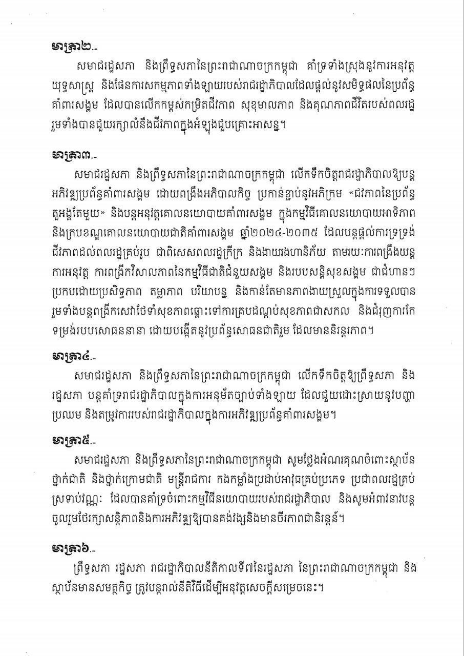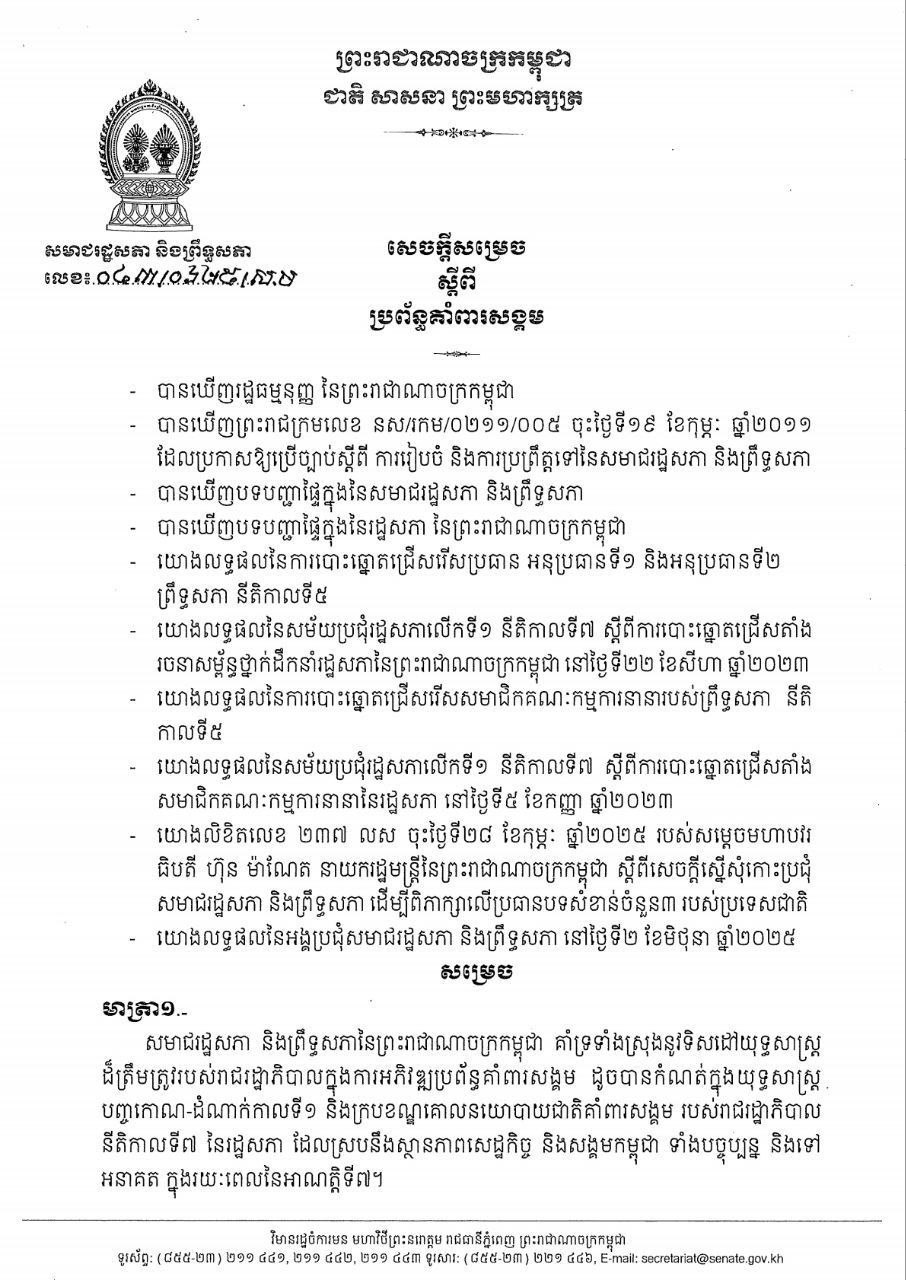 សមាជរដ្ឋសភា និងព្រឹទ្ធសភា ចេញសេចក្តីសម្រេចស្តីពី ប្រព័ន្ធគាំពារសង្គម លេខៈ០៤៣/០៦២៥/ស.ម