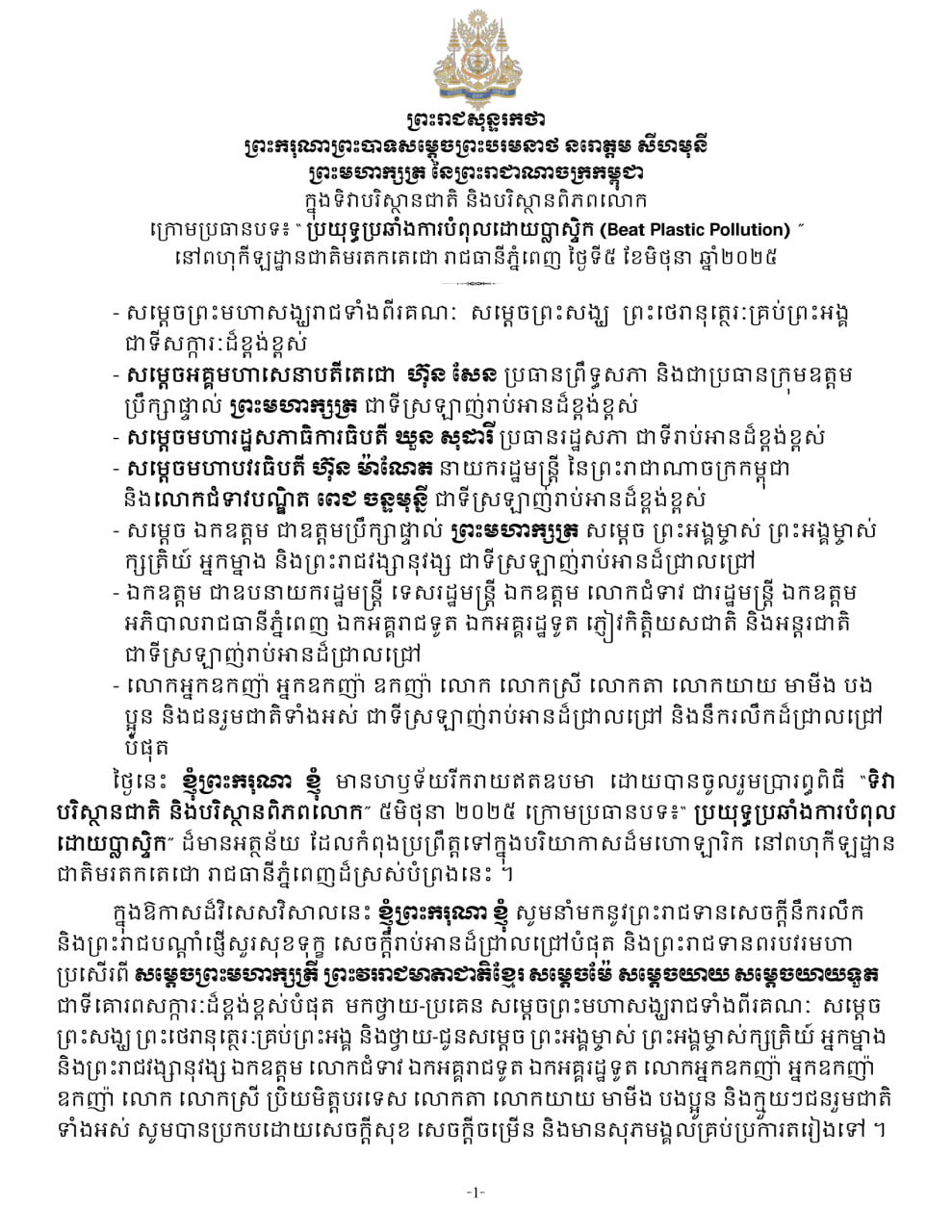 ព្រះរាជសុន្ទរកថាទាំងស្រុងរបស់ព្រះមហាក្សត្រ ក្នុងព្រះរាជពិធីទិវាបរិស្ថានជាតិ និងបរិស្ថានពិភពលោក ក្រោមប្រធានបទ៖ ប្រយុទ្ធប្រឆាំងការបំពុលដោយប្លាស្ទិក 5 June, 2025 ចែករំលែក FacebookTwitterTelegramWhatsAppEmail ពត៌មានទាក់ទង សារលិខិតអបអរសាទររបស់ ឯកឧត្តម ប្រាក់ សុខុន ក្នុងឱកាសអបអរ... ខ្លឹមសារ Press Briefing របស់ឯកឧត្តម ប៉ែន បូណា ប្រធានអង្... សូមទស្សនាវីដេអូ៖ កម្ពុជា ទឹកដីដែលមានប្រវត្តិសាស្ត្រច្បា... ខ្លឹមសារ Press Briefing របស់ឯកឧត្តម ប៉ែន បូណា ប្រធានអង្... ខ្លឹមសារ Press Briefing របស់ឯកឧត្តម ប៉ែន បូណា ប្រធានអង្... សារលិខិត សម្តេចមហាបវរធិបតី ហ៊ុន ម៉ាណែត នាយករដ្ឋមន្ត្រី ... Press OCM - អង្គភាពព័ត៌មាន និងប្រតិកម្មរហ័ស ពត៌មានផ្សេងៗ វិចារណកថា! កោះបៃតងតាមស្តង់ដារ IUCN៖ សមតុល្យរវាងការអភិរក្ស និងការអភិវឌ្ឍ 6 April, 2026 ការប្រែក្លាយកោះឱ្យទៅជា «កោះបៃតង» តាមស្តង់ដាររបស់សហភាពអន្តរជាតិ ដើម្បីការអភិរក្សធម្មជាតិ International Union for Conservation of Nature (IUCN) វិចារណកថា៖ ផ្កាថ្មប៉ប្រះទឹក និងការប្រែប្រួលអាកាសធា... 6 April, 2026 សម្តេចបវរធិបតី ហ៊ុន ម៉ាណែត ចេញសារលិខិតអបអរសាទរ ក្ន... 6 April, 2026 ឯកឧត្តមនាយឧត្តមសេនីយ៍ ឥត សារ៉ាត់ ចុះសួរសុខទុក្ខយោធ... 3 April, 2026