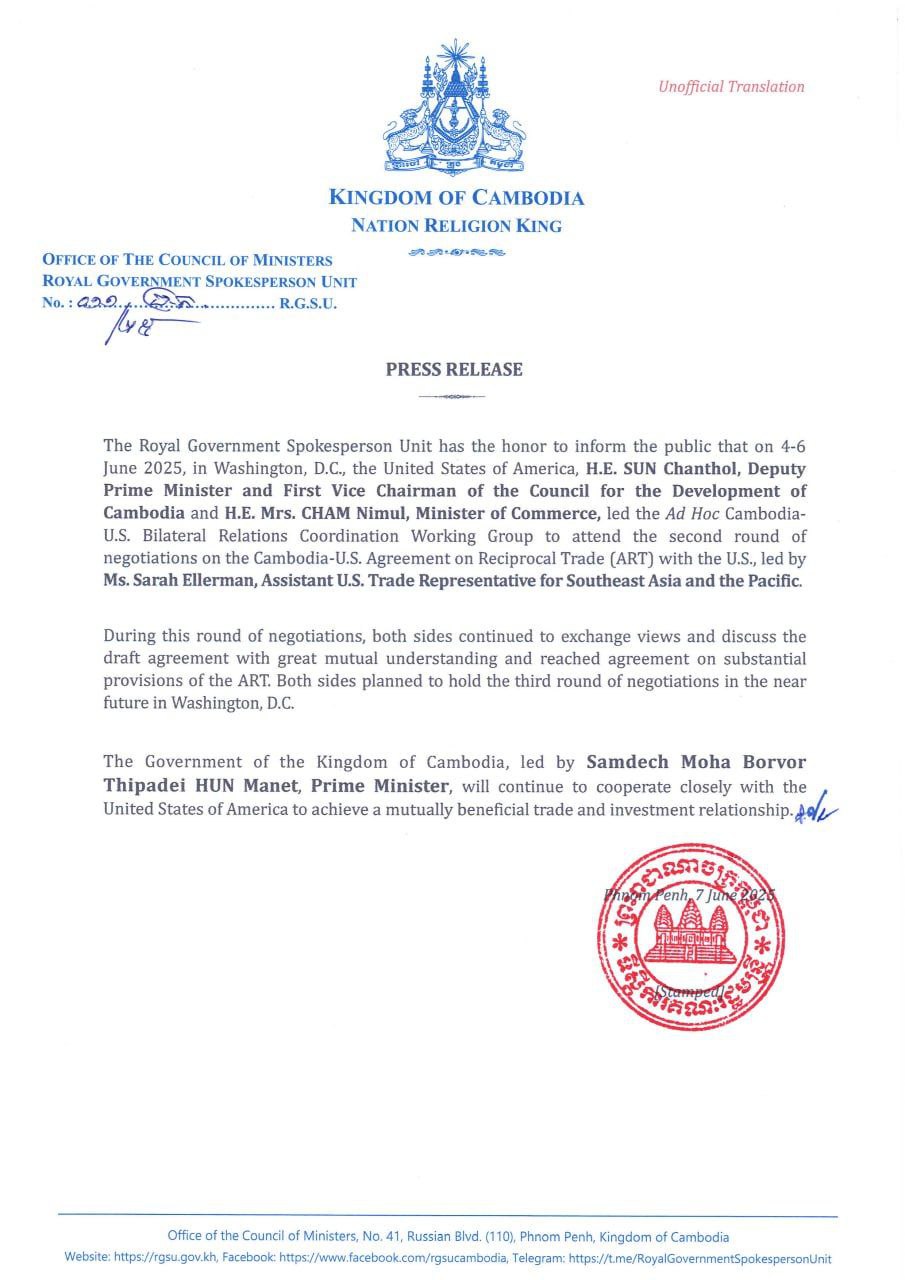 ក្នុងកិច្ចប្រជុំចរចាជុំទី២ ភាគីទាំងពីរបានបន្តពិភាក្សាគ្នាលើអត្ថបទសេចក្តីព្រាងកិច្ចព្រមព្រៀងពាណិជ្ជកម្មបដិការ ដោយឈរលើស្មារតីយោគយល់គ្នាខ្ពស់ និងបានឈានទៅឯកភាពគ្នាលើបញ្ញត្តិជាច្រើន។ នេះបើយោងតាមសេចក្តីប្រកាសព័ត៌មានរបស់អង្គភាពអ្នកនាំពាក្យរាជរដ្ឋាភិបាលចុះថ្ងៃទី៧ ខែមិថុនា ឆ្នាំ២០២៥។