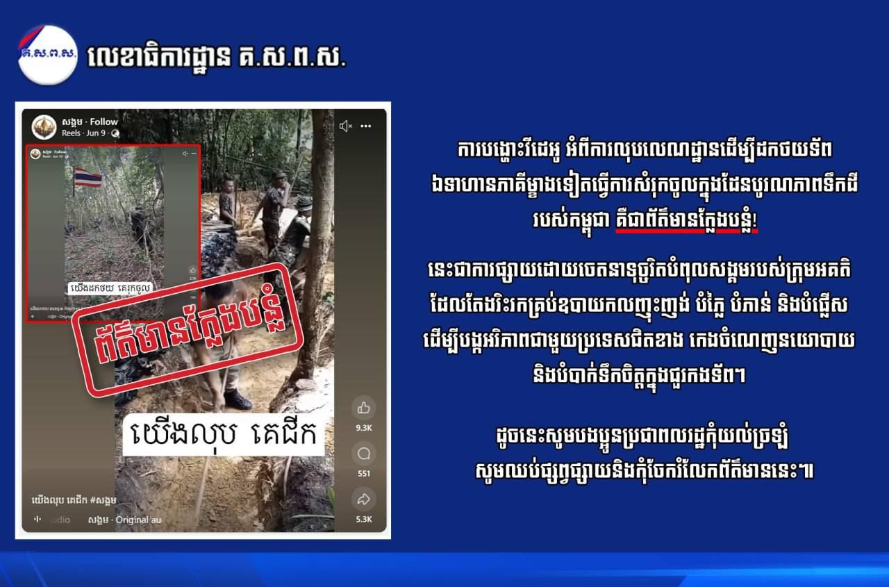 នាល្ងាចថ្ងៃអង្គារ ទី១០ ខែមិថុនា ឆ្នាំ២០២៥ នេះ លេខាធិការដ្ឋាននៃគណៈកម្មាធិការជាតិសម្របសម្រួលកិច្ចការព័ត៌មាននិងសាធារណមតិ ហៅកាត់ថា គ.ស.ព.ស. បានចេញមកបញ្ជាក់ថា ការបង្ហោះវីដេអូ អំពីការលុបលេណដ្ឋានដើម្បីដកទ័ពថយ ឯទាហាននៃភាគីម្ខាងទៀតធ្វើការសម្រុកចូលក្នុងដែននៃបូរណភាពទឹកដីកម្ពុជា គឺជា «ព័ត៌មានក្លែងបន្លំ។