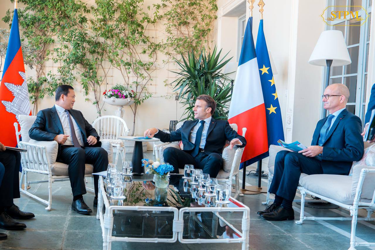 នាល្ងាចថ្ងៃទី១០ ខែមិថុនា ឆ្នាំ២០២៥, សម្តេចមហាបវរធិបតី ហ៊ុន ម៉ាណែត នាយករដ្ឋមន្ត្រីនៃព្រះរាជាណាចក្រកម្ពុជា បានជួបពិភាក្សាទ្វេភាគីជាមួយ ឯកឧត្តម Emmanuel Macron ប្រធានាធិបតី នៃសាធារណរដ្ឋបារាំង ក្នុងឱកាសអញ្ជើញចូលរួមសន្និសីទលើកទី៣ របស់អង្គការសហប្រជាជាតិ ស្តីពីមហាសមុទ្រ (UNOC3) នៅថ្ងៃទី០៨-១៣ ខែមិថុនា ឆ្នាំ២០២៥ នៅទីក្រុងនីស ប្រទេសបារាំង។