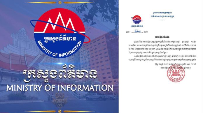 ក្រសួងព័ត៌មានមានកិត្តិយសសូមជម្រាបជូនដំណឹងដល់លោកអ្នកឧកញ៉ា អ្នកឧកញ៉ា ឧកញ៉ា លោកជំទាវ លោក លោកស្រីដែលជាម្ចាស់ស្ថានីយទូរទស្សន៍ទាំងអស់មេត្តាជ្រាបថា ចាប់ពីម៉ោង១២យប់ ថ្ងៃទី១២ ខែមិថុនា ឆ្នាំ២០២៥ នេះតទៅ សូមស្ថានីយទូរទស្សន៍ទាំងអស់នៅកម្ពុជា បញ្ឈប់ការចាក់ផ្សាយខ្សែភាពយន្តថៃគ្រប់ប្រភេទនៅលើកញ្ចក់ទូរទស្សន៍របស់ខ្លួន។