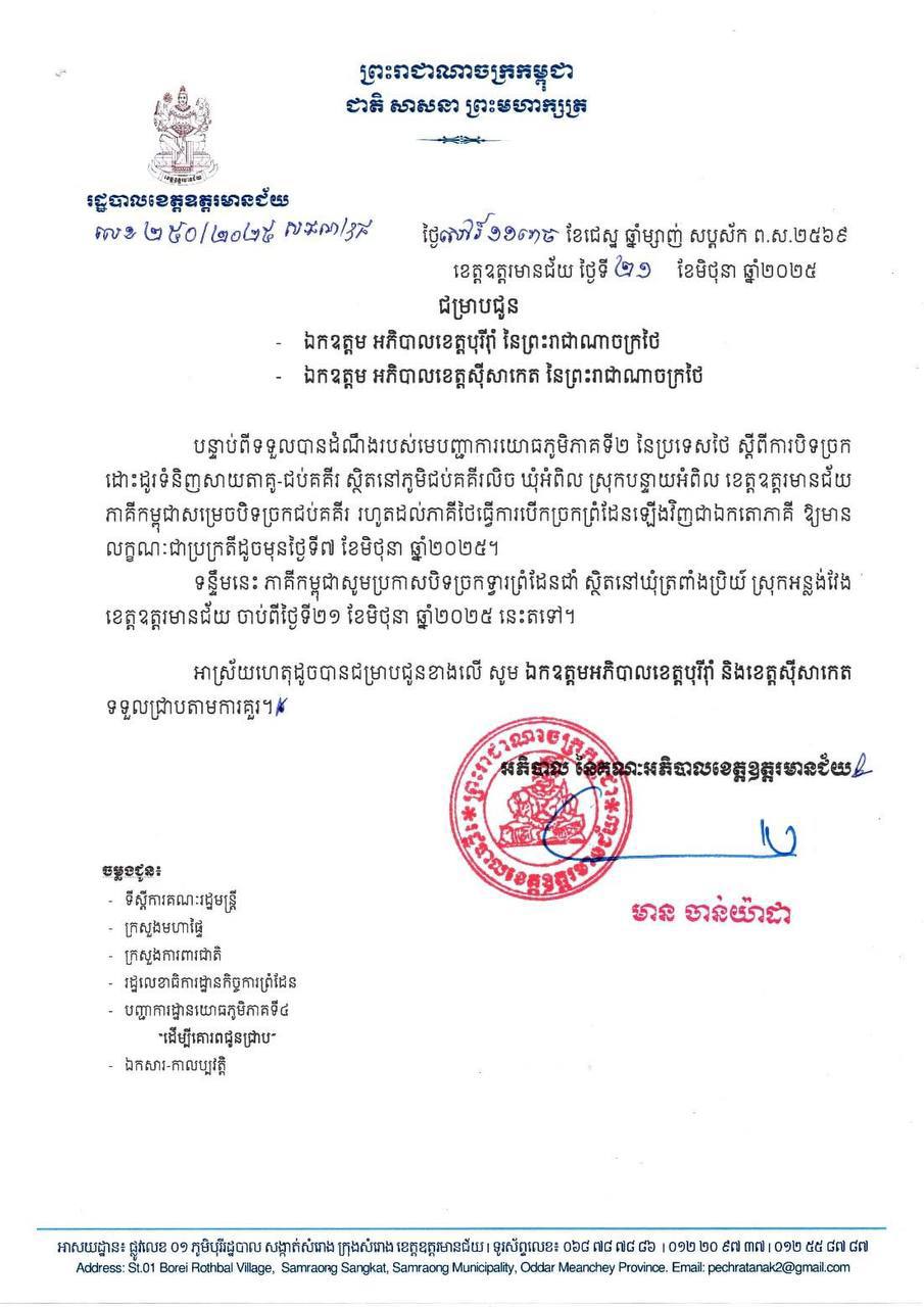 ចាប់ពីថ្ងៃទី០៧ ខែមិថុនា ឆ្នាំ២០២៥ កងទ័ពថៃបានប្រើប្រាស់វិធានការបិទច្រកព្រំដែន និងកែប្រែពេលវេលានៃការបិទ-បើកច្រកព្រំដែនរវាងប្រទេសទាំងពីរជាឯកតោភាគី ដោយមិនបានគិតអំពីផលប៉ះពាល់ដល់ការធ្វើដំណើរឆ្លងកាត់របស់ប្រជាជននៃប្រទេសទាំងពីរឡើយ។
