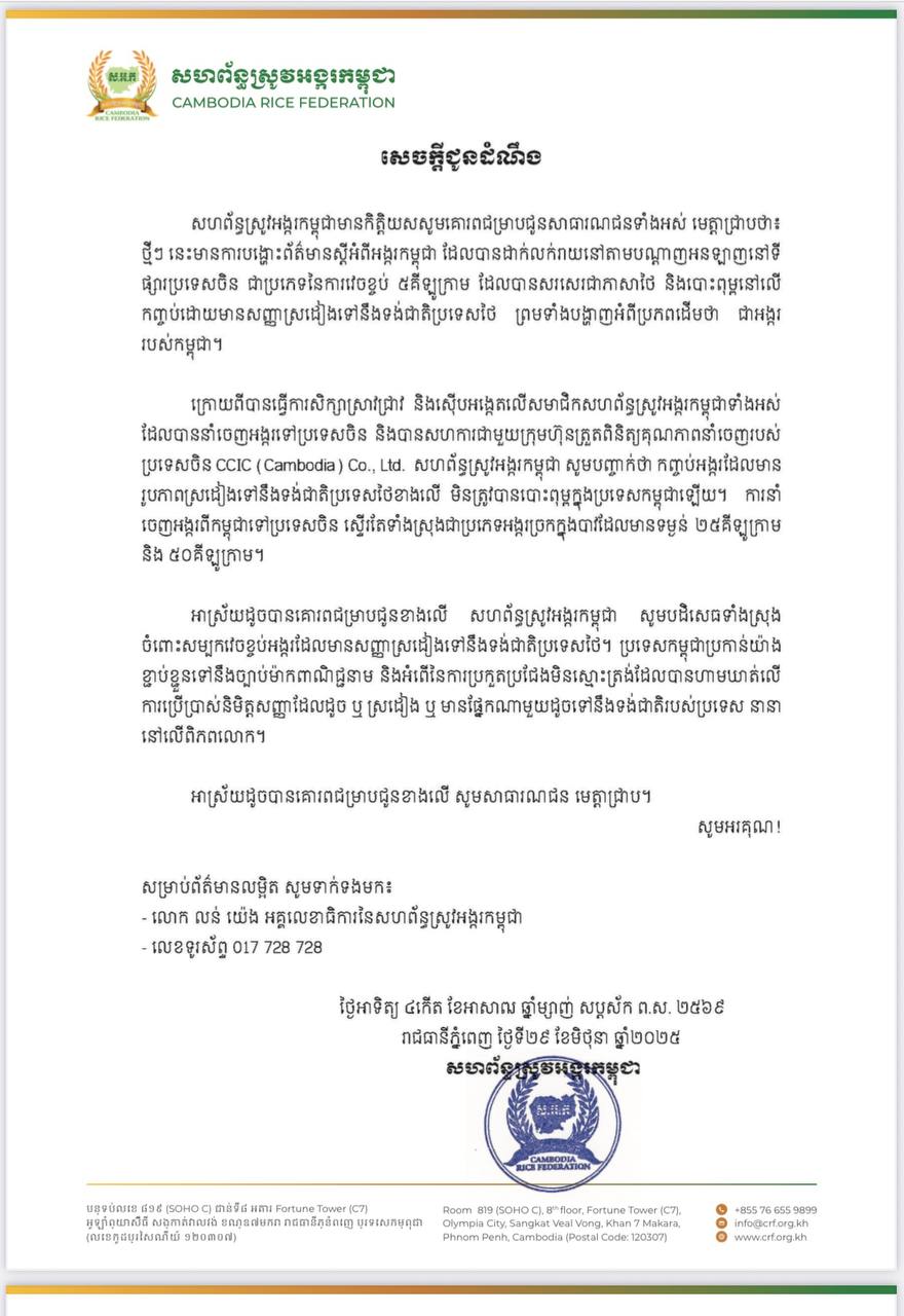 សហព័ន្ធស្រូវអង្ករកម្ពុជាមានកិត្តិយសសូមគោរពជម្រាបជូនសាធារណជនទាំងអស់ មេត្តាជ្រាបថា៖ ថ្មីៗ នេះមានការបង្ហោះព័ត៌មានស្តីអំពីអង្ករកម្ពុជា ដែលបានដាក់លក់រាយនៅតាមបណ្តាញអនឡាញនៅទីផ្សារប្រទេសចិន ជាប្រភេទនៃការវេចខ្ចប់ ៥គីឡូក្រាម ដែលបានសរសេរជាភាសាថៃ និងបោះពុម្ពនៅលើកញ្ចប់ដោយមានសញ្ញាស្រដៀងទៅនឹងទង់ជាតិប្រទេសថៃ ព្រមទាំងបង្ហាញអំពីប្រភពដើមថា ជាអង្កររបស់កម្ពុជា។