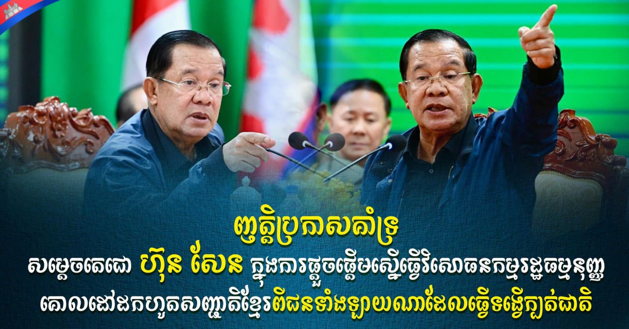 យើងខ្ញុំ សូមប្រកាសគាំទ្រយ៉ាងពេញទំហឹងនូវការផ្តួចផ្តើមគំនិតរបស់ សម្តេចតេជោ ក្នុងការស្នើរាជរដ្ឋាភិបាល សិក្សាអំពីទិដ្ឋភាពច្បាប់ ដើម្បីរៀបចំធ្វើវិសោធនកម្មរដ្ឋធម្មនុញ្ញ ក្នុងគោលដៅដកហូតសញ្ជាតិខ្មែរពីជនទាំងឡាយណា ដែលឃុបឃិតជាមួយបរទេស ធ្វើសកម្មភាពបំផ្លាញផលប្រយោជន៍ជាតិ និងសូមអំពាវនាវដល់បងប្អូនប្រជាពលរដ្ឋគាំទ្រការធ្វើវិសោធនកម្មរដ្ឋធម្មនុញ្ញ៕