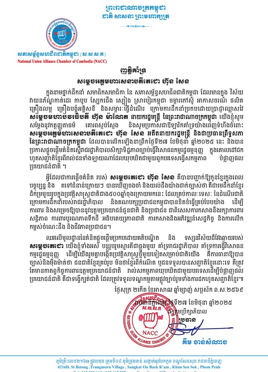 សភាសម្ព័ន្ធសហជីពជាតិកម្ពុជា (ស.ស.ស.ក) បានចេញញត្តិគាំទ្រប្រសាសន៍របស់សម្តេចតេជោ ហ៊ុន សែន ប្រធានព្រឹទ្ធសភាកម្ពុជា ដែលបានថ្លែងស្នើសុំឱ្យរាជរដ្ឋាភិបាលសិក្សាទិដ្ឋភាពច្បាប់ ដើម្បីធ្វើវិសោធនកម្មរដ្ឋធម្មនុញ្ញ ក្នុងគោលដៅដកហូតសញ្ជាតិខ្មែរពីរាល់ជនទាំងឡាយណាដែលឃុបឃិតជាមួយពួកបរទេសធ្វើសកម្មភាព បំផ្លាញផលប្រយោជន៍ជាតិ។