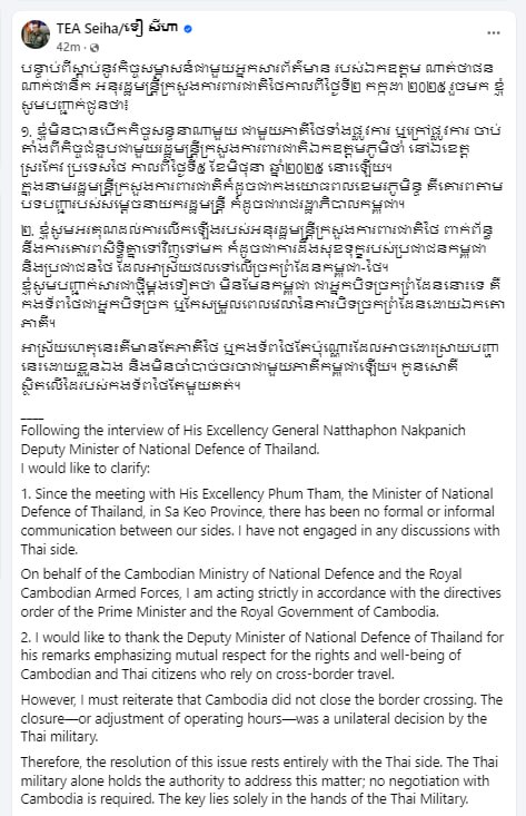 ឯកឧត្តមឧបនាយករដ្ឋមន្រ្តី ទៀ សីហា រដ្ឋមន្រ្តីក្រសួងការពារជាតិ តាមរយៈបណ្តាញសង្គមនៅរសៀលថ្ងៃទី៣ ខែកក្កដា ឆ្នាំ២០២៥ បានគូសបញ្ជាក់ថា បន្ទាប់ពីស្ដាប់នូវកិច្ចសម្ភាសន៍ជាមួយអ្នកសារព័ត៌មាន របស់ ឯកឧត្តម ណាត់ថាផន ណាក់ផានិក អនុរដ្ឋមន្ត្រីក្រសួងការពារជាតិថៃ កាលពីថ្ងៃទី២ កក្កដា ២០២៥ រួចមក ឯកឧត្តមសូមបញ្ជាក់ជូនថាជនរួមជាតិថា៖