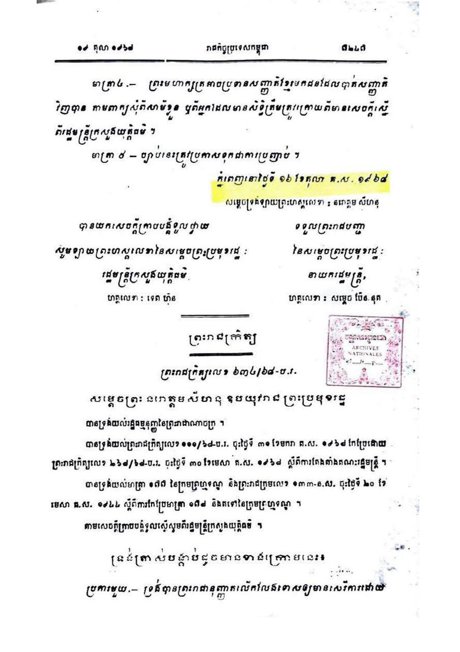 ទី១៖ ព្រះរាជក្រមដែលប្រកាសឲ្យប្រើច្បាប់ស្តីពីការបាត់សញ្ជាតិខ្មែរ ថ្ងៃទី១៦ ខែតុលា ឆ្នាំ១៩៦៨