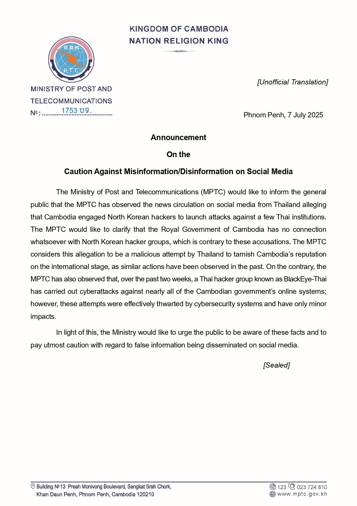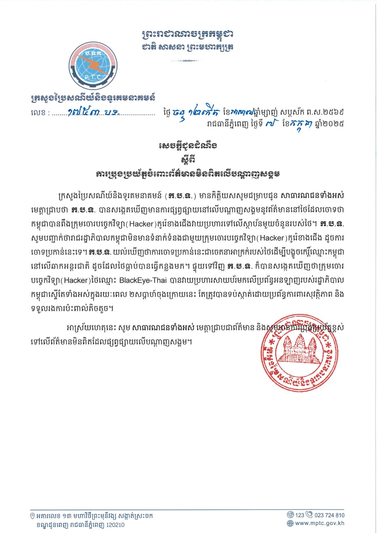 ក្រសួងប្រៃសណីយ៍ និងទូរគមនាគមន៍ សូមបញ្ជាក់ថា រាជរដ្ឋាភិបាលកម្ពុជា មិនមានទំនាក់ទំនងជាមួយក្រុមចោរបច្ចេកវិទ្យា (Hacker) កូរ៉េខាងជើង ដូចការចោទប្រកាន់នេះទេ។ ក្រសួងយល់ឃើញថា ការចោទប្រកាន់នេះ ជាចេតនាអាក្រក់របស់ថៃ ដើម្បីបង្អួចកេរ្តិ៍ឈ្មោះកម្ពុជានៅលើឆាកអន្តរជាតិ ដូចដែលថៃធ្លាប់បានធ្វើកន្លងមក។