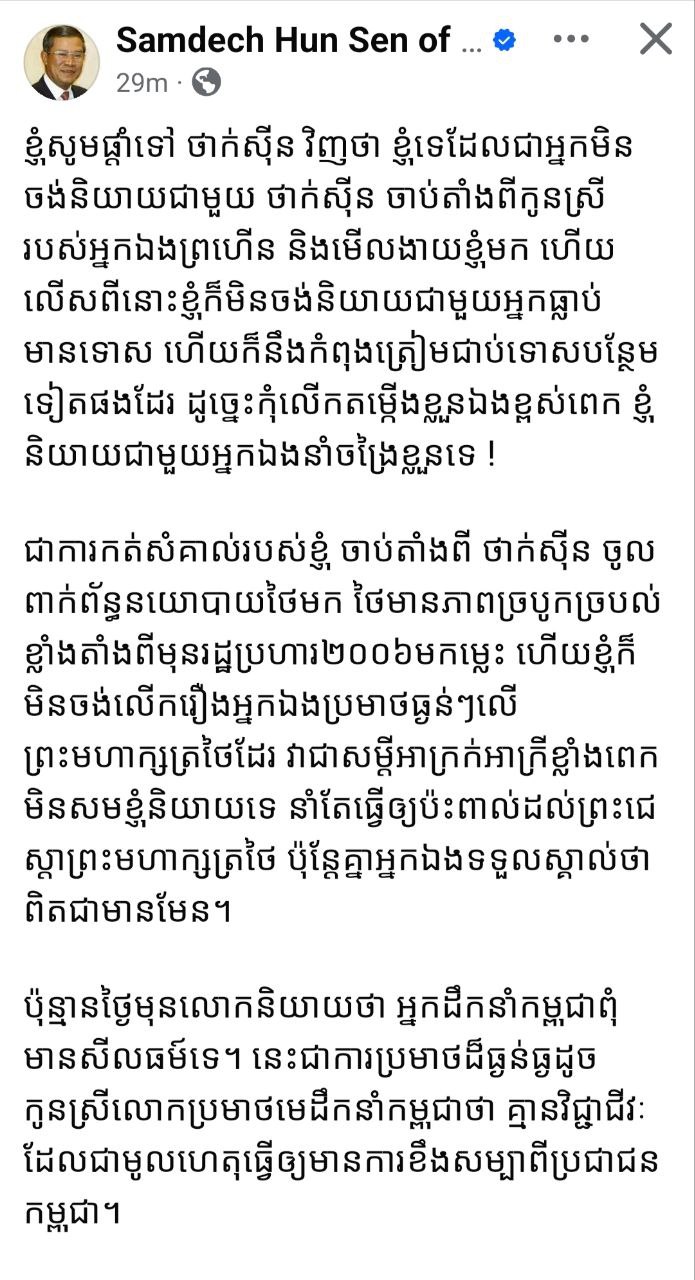 សម្ដេចតេជោ ហ៊ុន សែន ប្រធានព្រឹទ្ធសភានៃកម្ពុជាតាមរយៈបណ្ដាញសង្គម នៅរសៀលថ្ងៃទី២០ ខែកក្កដាឆ្នាំ២០២៥ បានបង្ហោះសារបញ្ជាក់ជាថ្មីឱ្យដឹងថា លោក ថាក់ស៊ីន បានប្រមាថព្រះមហាក្សត្រថៃយ៉ាងធ្ងន់ធ្ងរ ហើយព្រមទាំងបានស្នើសុំយោបល់សម្ដេចតេជោ ពាក់ព័ន្ធនឹងការបង្កើតគណបក្សភឿថៃផងដែរ។ ខាងក្រោមនេះគឺជាការបង្ហោះផ្សាយរបស់សម្ដេចតេជោ ហ៊ុន សែនដូ ចតទៅ៖