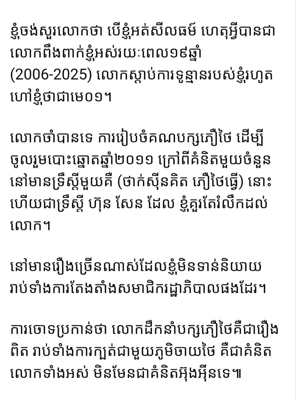 ខ្ញុំចង់សួរលោកថា បើខ្ញុំអត់សីលធម៌ ហេតុអ្វីបានជាលោកពឹងពាក់ខ្ញុំអស់រយៈពេល១៩ឆ្នាំ (2006-2025) លោកស្តាប់ការទូន្មានរបស់ខ្ញុំរហូតហៅខ្ញុំថាជាមេ០១។