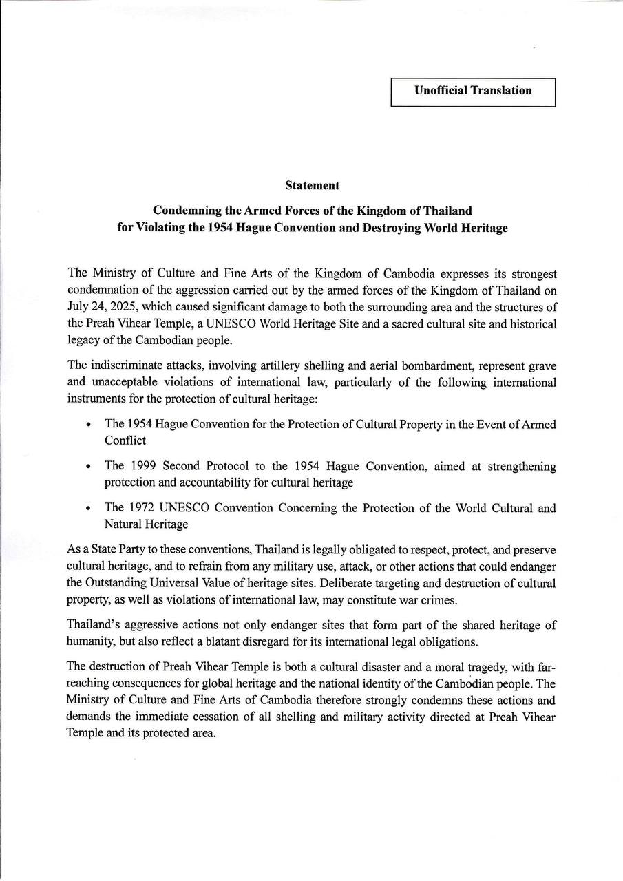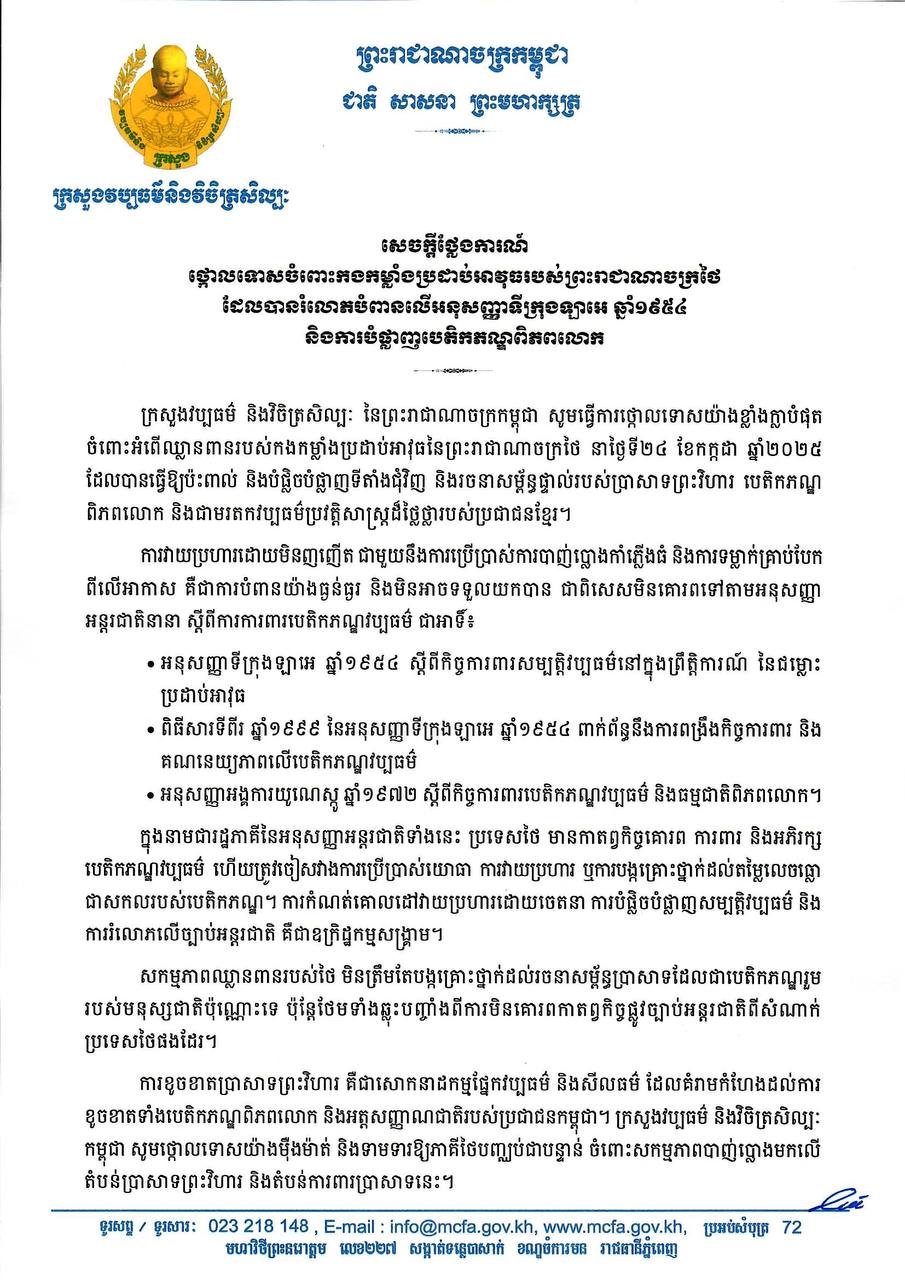 ក្រសួងវប្បធម៌ និងវិចិត្រសិល្បៈ នៃព្រះរាជាណាចក្រកម្ពុជា បានធ្វើការថ្កោលទោសយ៉ាងខ្លាំងក្លាបំផុត ចំពោះអំពើឈ្លានពានរបស់កងកម្លាំងប្រដាប់អាវុធនៃព្រះរាជាណាចក្រថៃ នាថ្ងៃទី២៤ ខែកក្កដា ឆ្នាំ២០២៥ ដែលបានធ្វើឱ្យប៉ះពាល់ និងបំផ្លិចបំផ្លាញទីតាំងជុំវិញ និងរចនាសម្ព័ន្ធផ្ទាល់របស់ប្រាសាទព្រះវិហារ បេតិកភណ្ឌ ពិភពលោក និងជាមរតកវប្បធម៌ប្រវត្តិសាស្ត្រដ៏ថ្លៃថ្លារបស់ប្រជាជនខ្មែរ។ នេះបើយោងតាមសេចក្តីថ្លែងការណ៍របស់ក្រសួងវប្បធម៌ចុះថ្ងៃទី២៤ ខែកក្កដា ឆ្នាំ២០២៥។