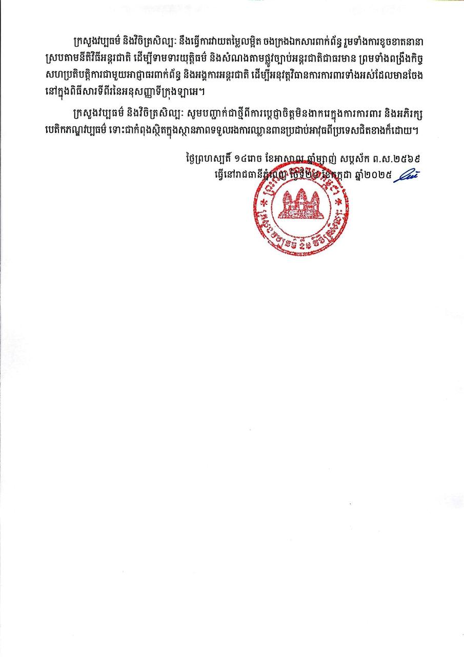 ក្រសួងវប្បធម៌ និងវិចិត្រសិល្បៈ បានបញ្ជាក់ជាថ្មីពីការប្តេជ្ញាចិត្តមិនងាករេក្នុងការការពារ និងអភិរក្ស បេតិកភណ្ឌវប្បធម៌ ទោះជាកំពុងស្ថិតក្នុងស្ថានភាពទទួលរងការឈ្លានពានប្រដាប់អាវុធពីប្រទេសជិតខាងក៏ដោយ៕