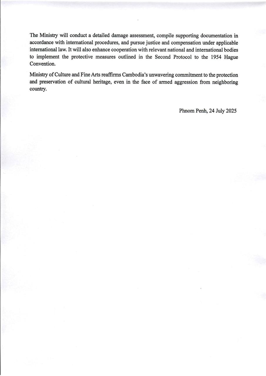 ការខូចខាតប្រាសាទព្រះវិហារ គឺជាសោកនាដកម្មផ្នែកវប្បធម៌ និងសីលធម៌ ដែលគំរាមកំហែងដល់ការ ខូចខាតទាំងបេតិកភណ្ឌពិភពលោក និងអត្តសញ្ញាណជាតិរបស់ប្រជាជនកម្ពុជា។ ក្រសួងវប្បធម៌ និងវិចិត្រសិល្បៈ កម្ពុជា សូមថ្កោលទោសយ៉ាងម៉ឺងម៉ាត់ និងទាមទារឱ្យភាគីថៃបញ្ឈប់ជាបន្ទាន់ ចំពោះសកម្មភាពបាញ់ផ្លោងមកលើ តំបន់ប្រាសាទព្រះវិហារ និងតំបន់ការពារប្រាសាទនេះ។