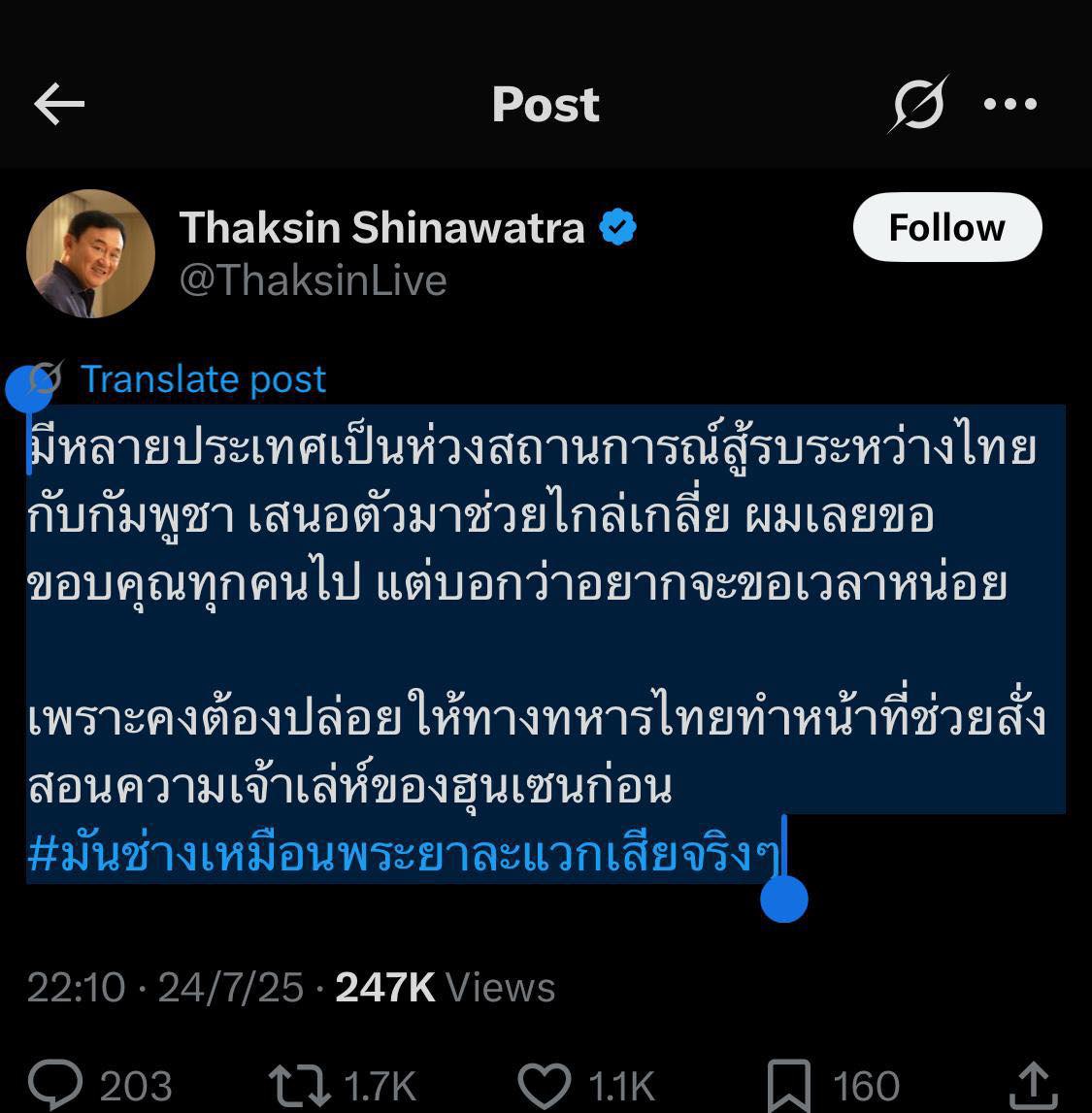 មុននេះ ថាក់ ស៊ីន បង្ហាះសារដែលមានចរិតប្រើប្រាស់សង្រ្គាម ដើម្បីប្រដៅ ហ៊ុន សែន។ សំដីរបស់ ថាក់ ស៊ីន កាន់តែបង្ហាញច្បាស់នូវការឈ្លានពានកម្ពុជាពីសំណាក់កងទ័ពថៃមកលើកម្ពុជា។