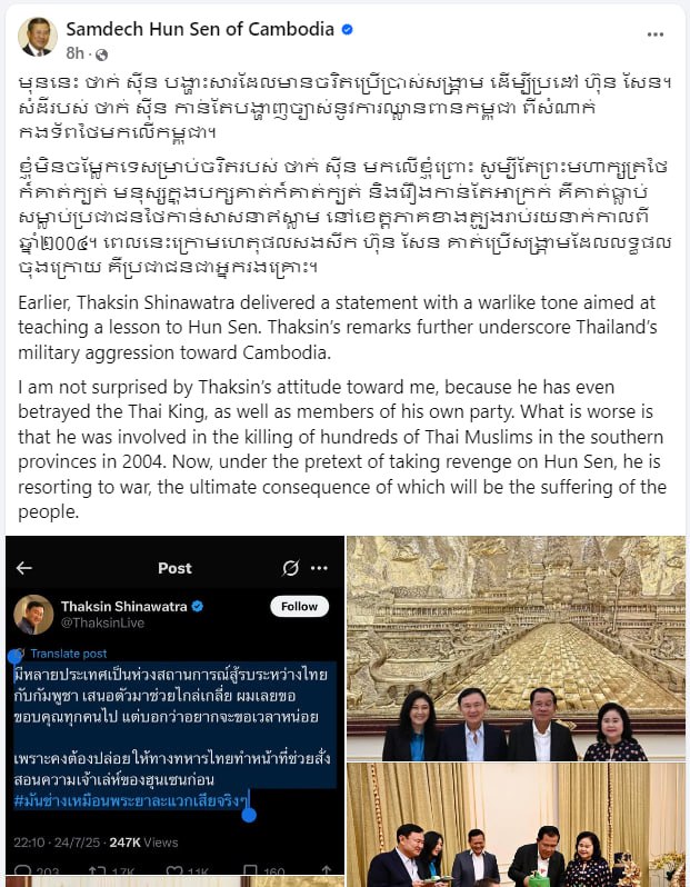 សម្តេចតេជោ ហ៊ុន សែន ប្រធានព្រឹទ្ធសភាកម្ពុជា តាមរយៈបណ្តាញសង្គម បានឱ្យដឹងថា លោក ថាក់ស៊ីន ស៊ីណាវ៉ាត្រា អតីតនាយករដ្ឋមន្ត្រីថៃ គឺជាមនុស្សដែលមានចរិតប្រើប្រាស់សង្រ្គាមដើម្បីជាការសងសឹកជាមួយសម្តេច ដែលប្រការនេះកាន់តែបង្ហាញច្បាស់ថា កងទ័ពថៃពិតជាធ្វើការឈ្លានពានមកលើអធិបតេយ្យរបស់កម្ពុជា។