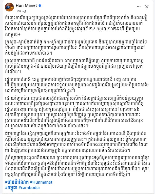 សម្តេចធិបតី ហ៊ុន ម៉ាណែត នាយករដ្ឋមន្រ្តីនៃកម្ពុជា តាមរយៈបណ្តាញសង្គម នៅថ្ងៃទី២៧ ខែកក្កដា ឆ្នាំ២០២៥ បានបង្ហោះខ្លឹមសារដូចតទៅ៖