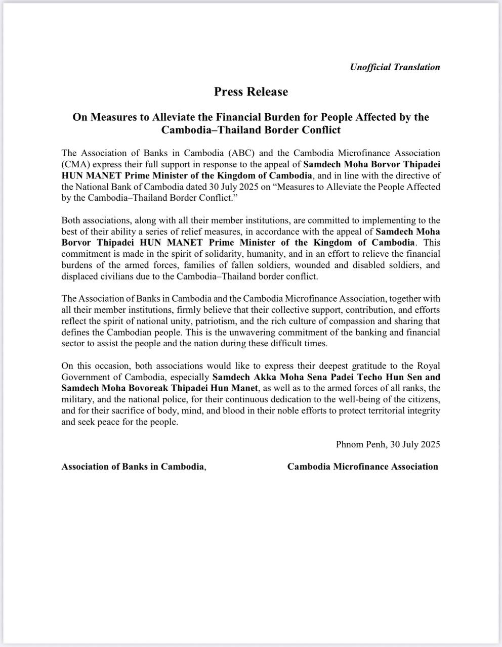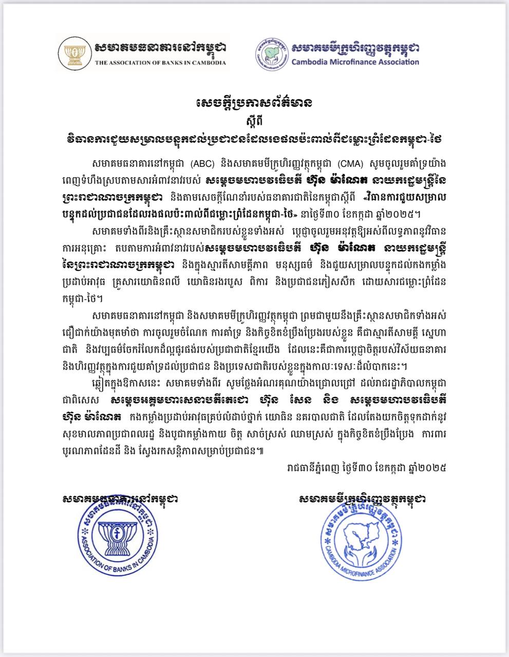 សមាគមធនាគារនៅកម្ពុជា (ABC) និងសមាគមមីក្រូហិរញ្ញវត្ថុកម្ពុជា (CMA) បានប្រកាសគាំទ្រពេញទំហឹងស្របតាមសារអំពាវនាវរបស់រាជរដ្ឋាភិបាល និងតាមសេចក្ដីណែនាំរបស់ធនាគារជាតិនៃកម្ពុជាស្តីពី «វិធានការជួយសម្រាលបន្ទុកដល់ប្រជាជនដែលរងផលប៉ះពាល់ពីជម្លោះព្រំដែនកម្ពុជា-ថៃ» នាថ្ងៃទី៣០ ខែកក្កដា ឆ្នាំ២០២៥ ។