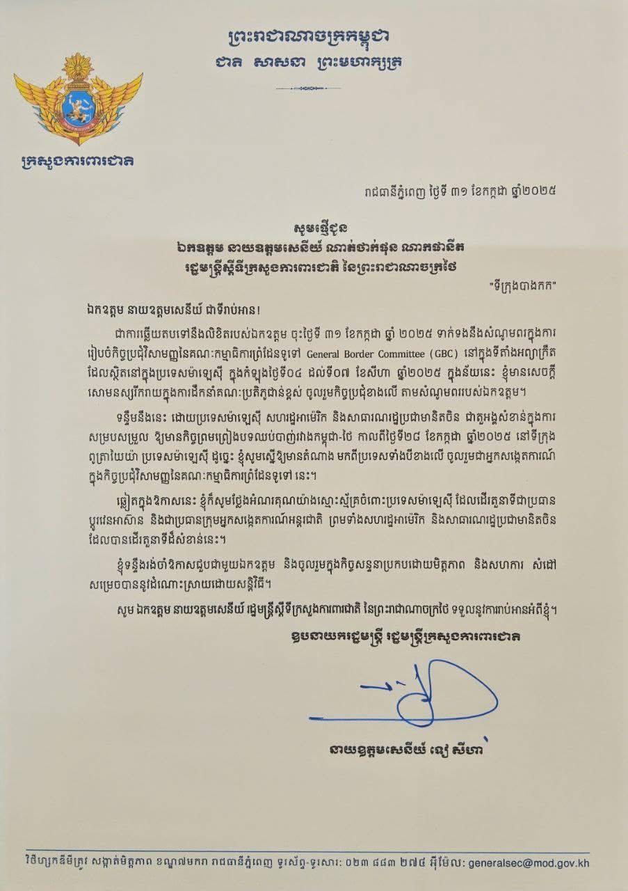គួរបញ្ជាក់ថា កាលពីថ្ងៃទី៣១ ខែកក្កដា ឆ្នាំ២០២៥ ក្រសួងការពារជាតិកម្ពុជាបានឆ្លើយតបទៅនឹងលិខិតរបស់រដ្ឋមន្ត្រីស្ដីទីក្រសួងការពារជាតិថៃ ដោយបានឯកភាពទៅនឹងសំណើសុំប្ដូរទីតាំងនៃកិច្ចប្រជុំទៅធ្វើនៅប្រទេសម៉ាឡេស៊ី។ នៅក្នុងលិខិតរបស់ក្រសួងការពារជាតិកម្ពុជាដដែល ឯកឧត្តមឧបនាយករដ្ឋមន្ត្រី ទៀ សីហា បានស្នើត្រឡប់ទៅភាគីថៃវិញ សូមឲ្យម៉ាឡេស៊ី សហរដ្ឋអាម៉េរិក និងចិន ចូលរួមសង្កេតការណ៍នៅក្នុងកិច្ចប្រជុំនេះ៕