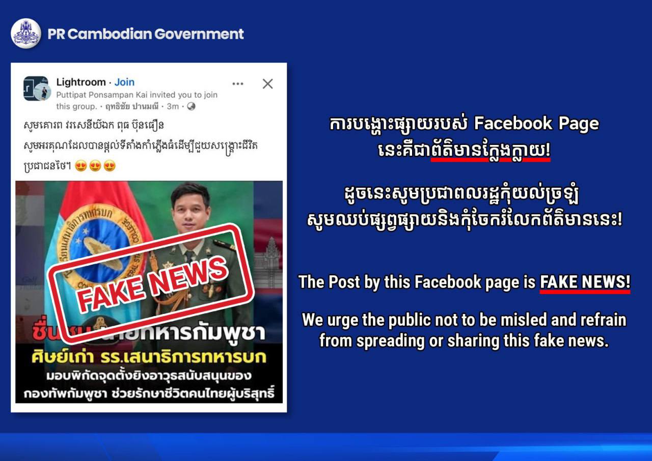 យោងលើការបង្ហោះផ្សាយនៅលើបណ្ដាញសង្គមរបស់ Page PR Cambodian Government នៅថ្ងៃទី១ ខែសីហា ឆ្នាំ២០២៥នេះ បានឱ្យដឹងថា ការផ្សាយរបស់ Facebook Group នេះ គឺជាព័ត៌មានក្លែងក្លាយ។
