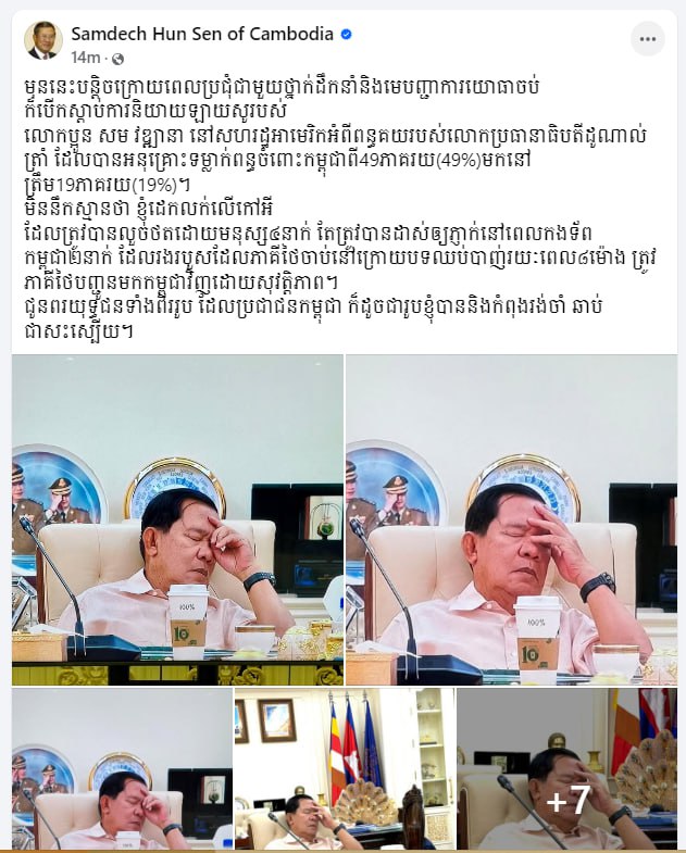 មុននេះបន្តិចក្រោយពេលប្រជុំជាមួយថ្នាក់ដឹកនាំ និងមេបញ្ជាការយោធាចប់ក៏បើកស្តាប់ការនិយាយឡាយសូរបស់លោកប្អូន សម វឌ្ឍានា នៅសហរដ្ឋអាមេរិក អំពីពន្ធគយរបស់លោកប្រធានាធិបតី ដូណាល់ ត្រាំ ដែលបានអនុគ្រោះទម្លាក់ពន្ធចំពោះកម្ពុជាពី49ភាគរយ(49%)មកនៅត្រឹម19ភាគរយ(19%)។