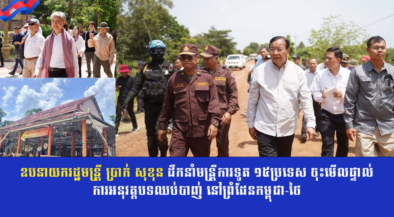 នៅថ្ងៃទី ១ ខែសីហា ឆ្នាំ ២០២៥ ឯកឧត្តម ប្រាក់ សុខុន ឧបនាយករដ្ឋមន្ត្រី និងជារដ្ឋមន្ត្រីក្រសួងការបរទេស និងសហប្រតិបត្តិការអន្តរជាតិ បានអញ្ជើញដឹកនាំគណៈប្រតិភូស្ថានទូតនានាប្រចាំកម្ពុជា ចំនួន១៥ប្រទេស ទៅកាន់តំបន់ព្រំដែន ក្នុងនៅឃុំគោកមន ស្រុកបន្ទាយអំពិល ខេត្តឧត្តរមានជ័យ ដើម្បីពិនិត្យទីតាំងដែលរងការខូចខាតយ៉ាងធ្ងន់ធ្ងរក្នុងអំឡុងពេលប្រាំថ្ងៃនៃការទម្លាក់គ្រាប់បែករបស់យោធាថៃ។