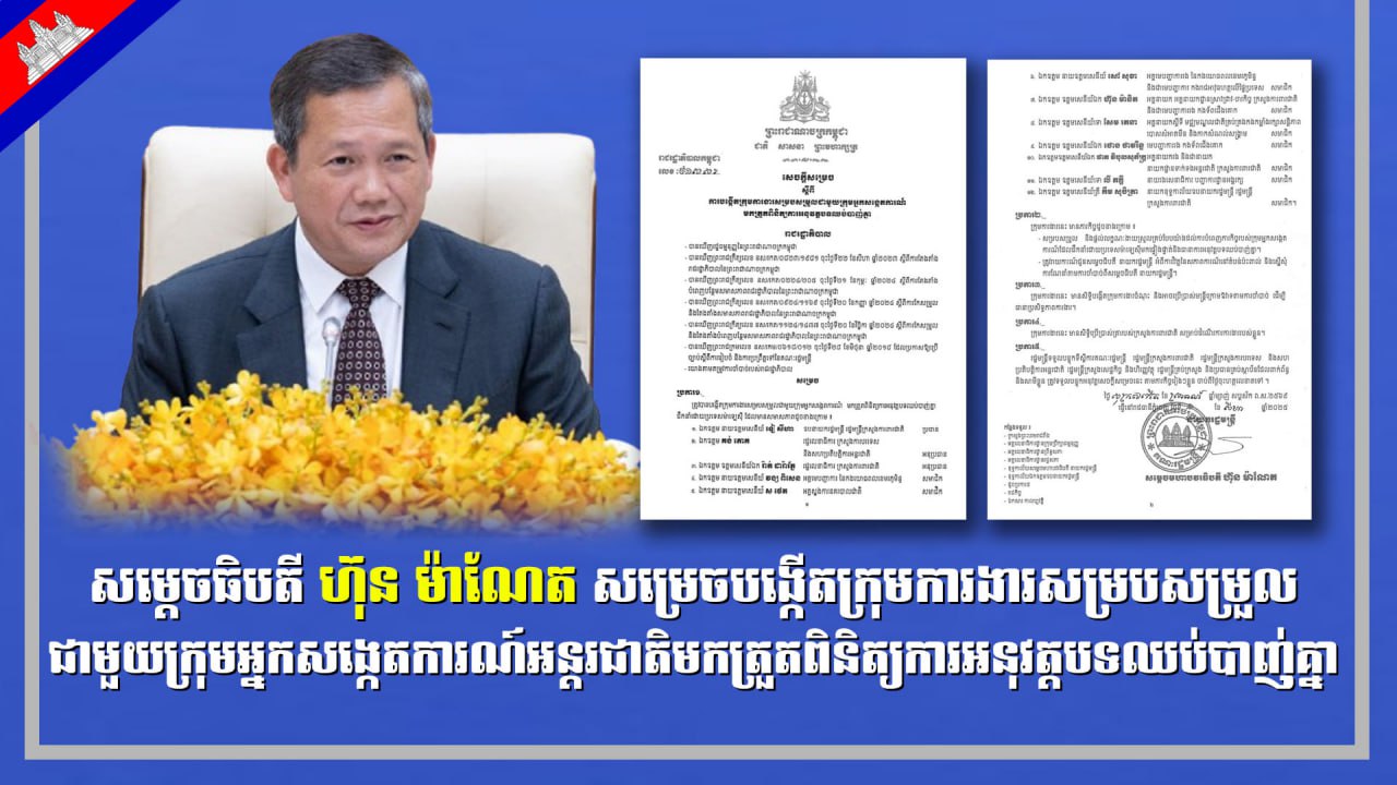 សម្តេចធិបតី ហ៊ុន ម៉ាណែត នាយករដ្ឋមន្រ្តីនៃរាជរដ្ឋាភិបាលកម្ពុជា នៅថ្ងៃទី១ ខែសីហា ឆ្នាំ២០២៥ បានចេញ សេចក្តីសម្រេចស្តីពីការបង្កើតក្រុមការងារសម្របសម្រួលជាមួយក្រុមអ្នកសង្កេតការណ៍មកត្រួតពិនិត្យការអនុវត្ត បទឈប់បាញ់គ្នាដឹកនាំដោយប្រទេសម៉ាឡេស៊ី។