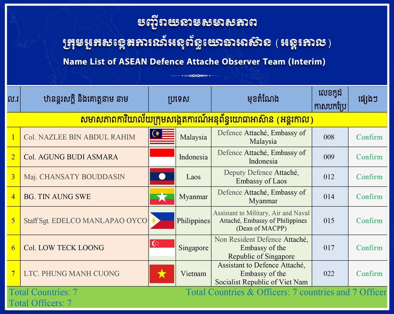 “The representative will visit several locations to observe the implementation of ceasefire agreement including Oddar Meanchey and Preah Vihear Province which had been mainly affected by the arm clashes between Cambodian and Thai Military ,” H.E. Lt. Gen. Maly Socheata confirmed. “This activity is the follow up on the special meeting on July 28, 2025 in Malaysia which let to agreement on the ceasefire and has so far improved the situation at the border. During this visit the ASEAN Defense Attaché Observer Group (Interim) led by Malaysian Defense Attaché will carry out its mission over a full two-week period.”